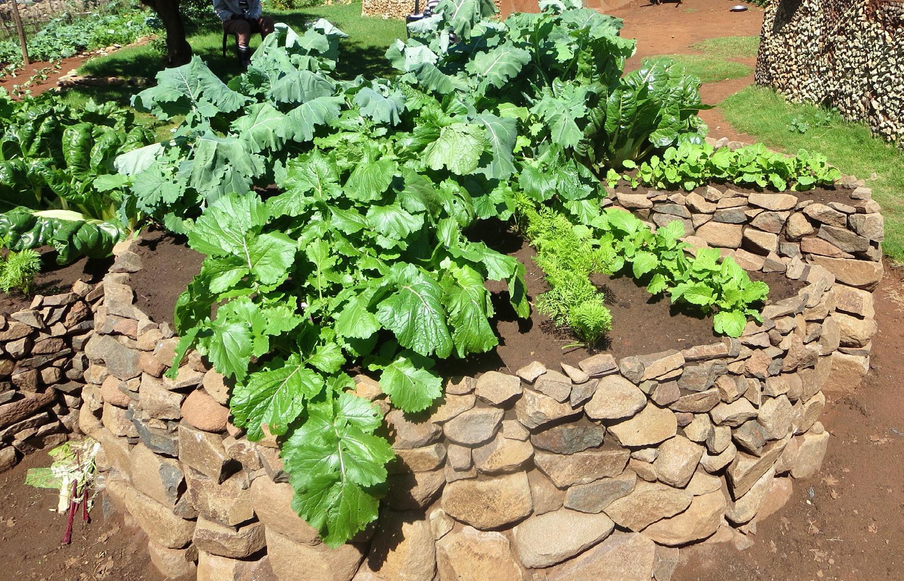 Traditional keyhole gardens use logs and chunks of wood in the bottom, reminiscent of the hügelkultur concept where the garden is created as a mound with these materials buried at the base. As they slowly break down, they create a bio-sponge which retains water, making it a self-sustaining system when used in large scale settings. A keyhole garden lacks the surface area to achieve the same results as a massive hügelkultur mound, but the concept does reduce the need for additional watering.