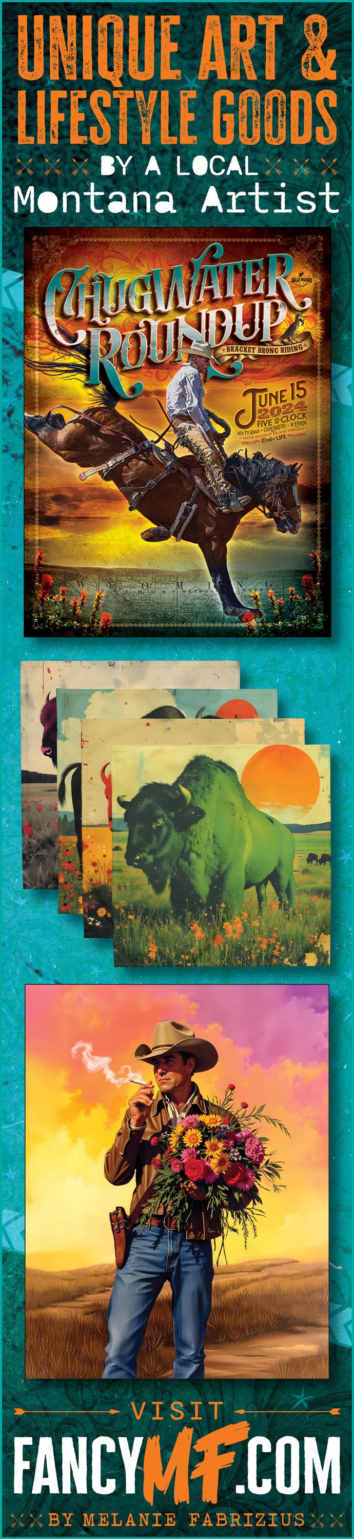 Melanie grew up on a farm in Montana and is currently living in Billings. Her life-long love of art led her to a career as a freelance graphic artist. Melanie enjoys camping, rockhounding, fashion and watching the sunset with her two dogs, Comanche Sue and Pistol Annie. Check out her art at www.fancymf.com