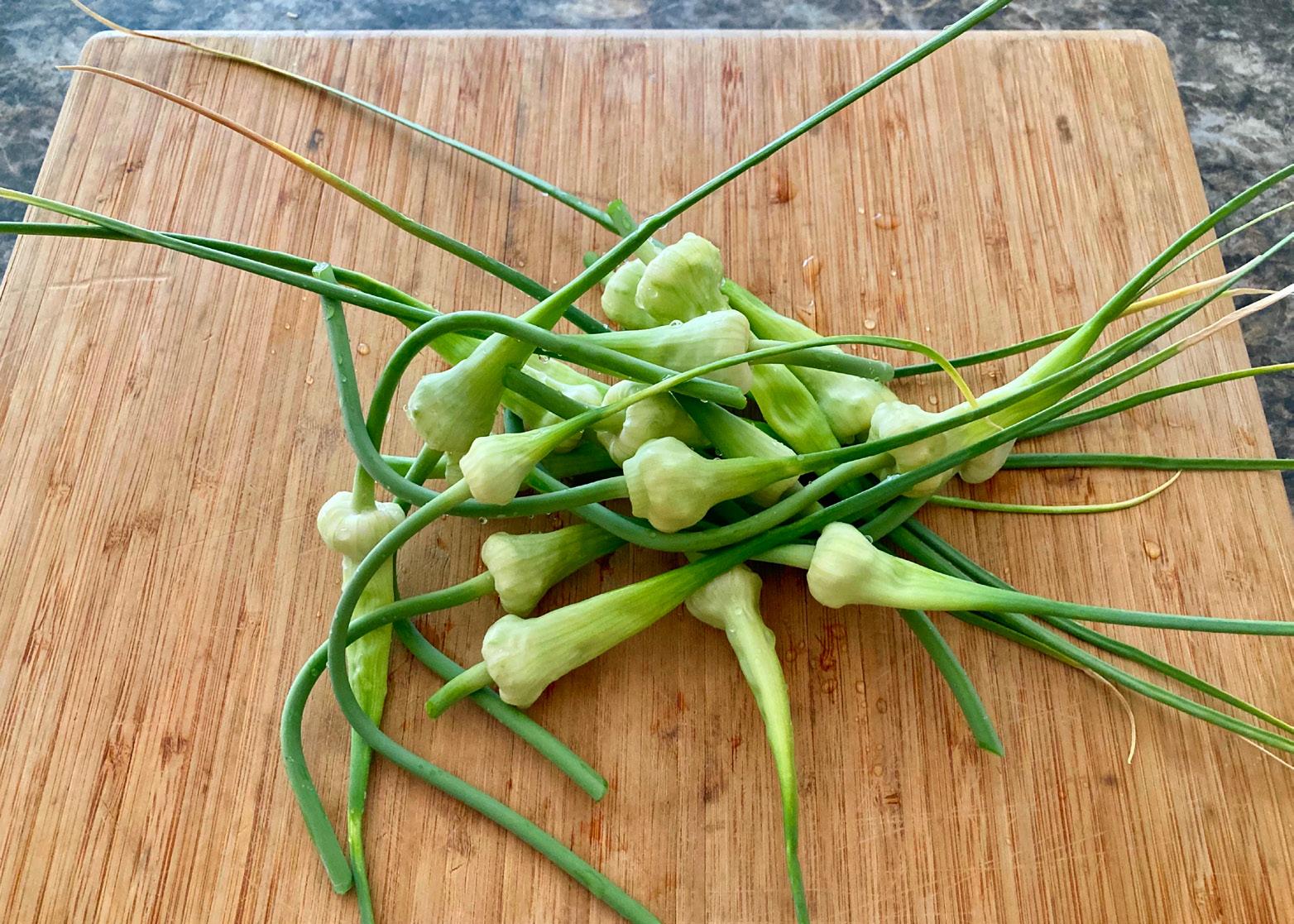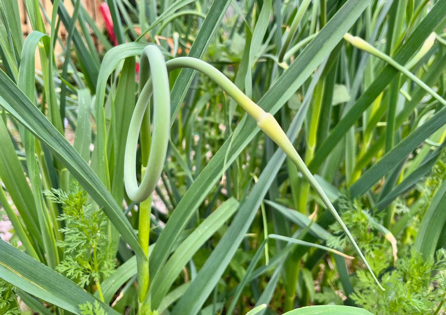 When the scapes form in June, cut them off to force more energy into the bulbs, but don’t discard them. The garlic scapes have a milder flavor but are delicious when chopped into any dish that needs a little garlic touch.