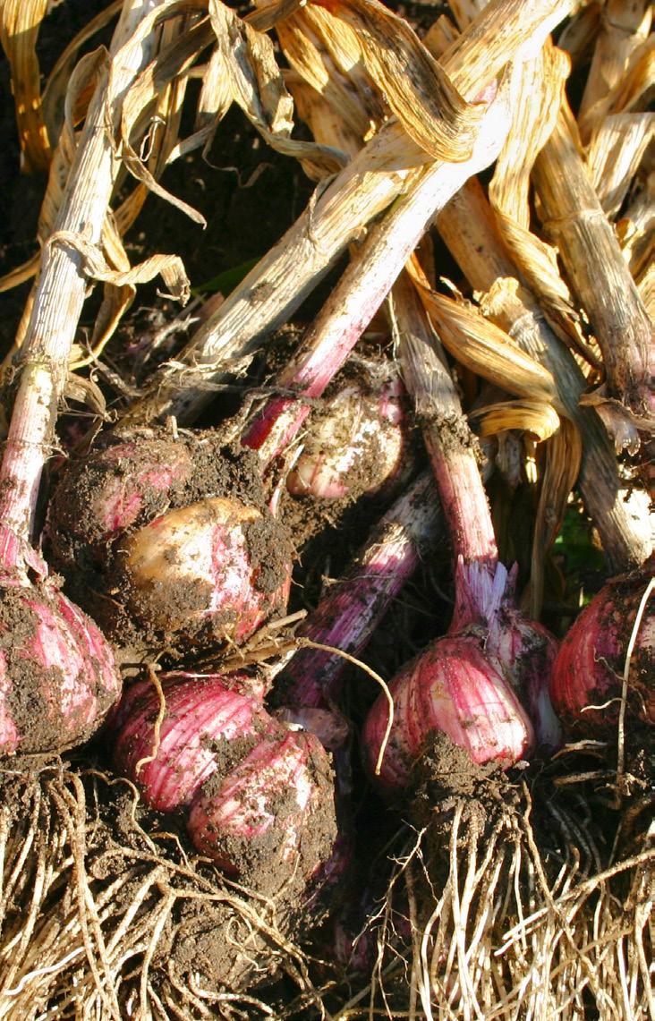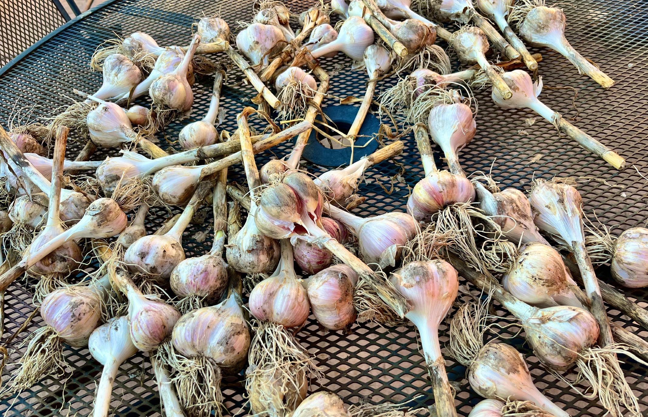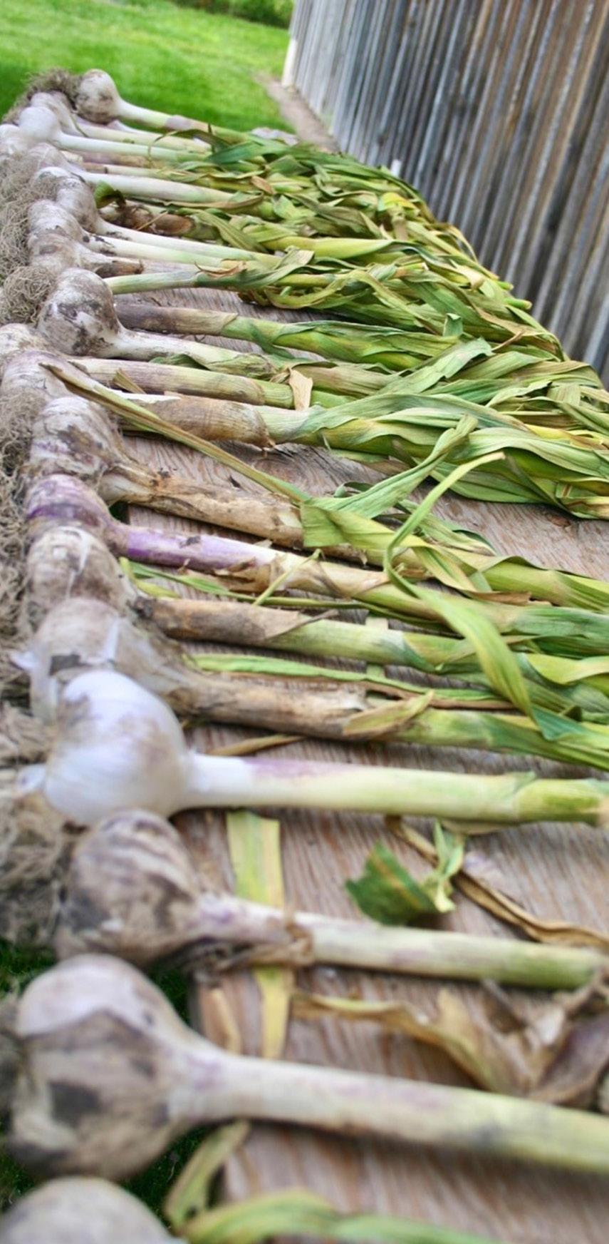 Harvest garlic in late July when the leaves are dying back. After digging the garlic and removing the soil, cut back the stems to roughly four inches and place the garlic somewhere out of direct sunlight to cure for a couple of weeks before preparing it for longterm storage.