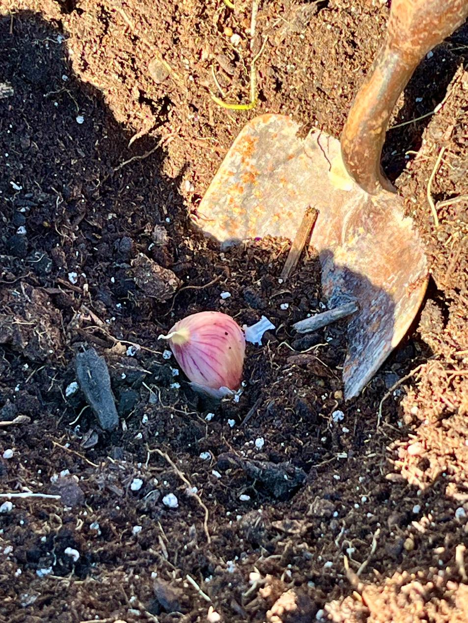 Planting garlic is as easy as digging a hole and setting in the clove, making sure the pointy side is facing up.