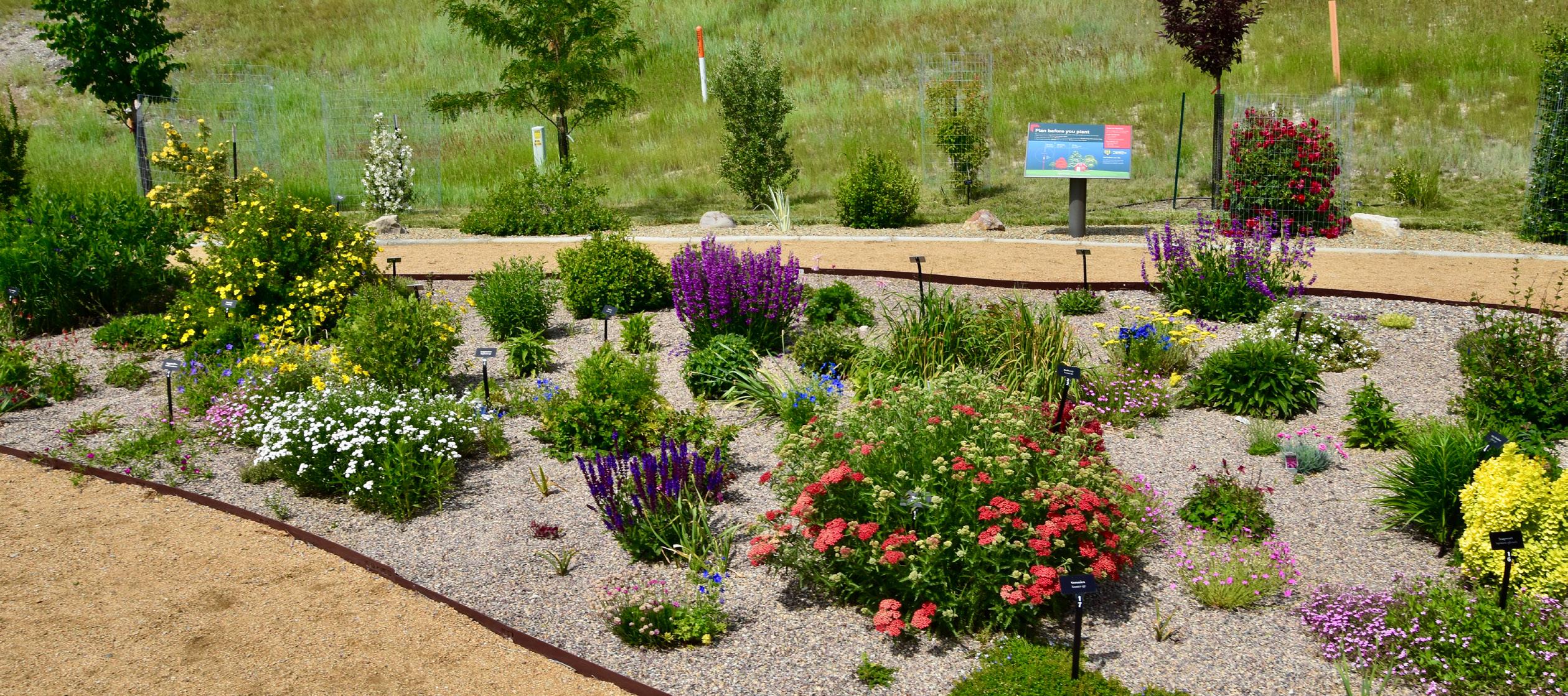 One flower garden at the Firewise Garden is an example of spacing plants farther apart, with very few touching one another, which reduces potential fuel sources near a home. In this bed, landscape fabric was used to suppress weeds and pea gravel as a non-flammable mulch.