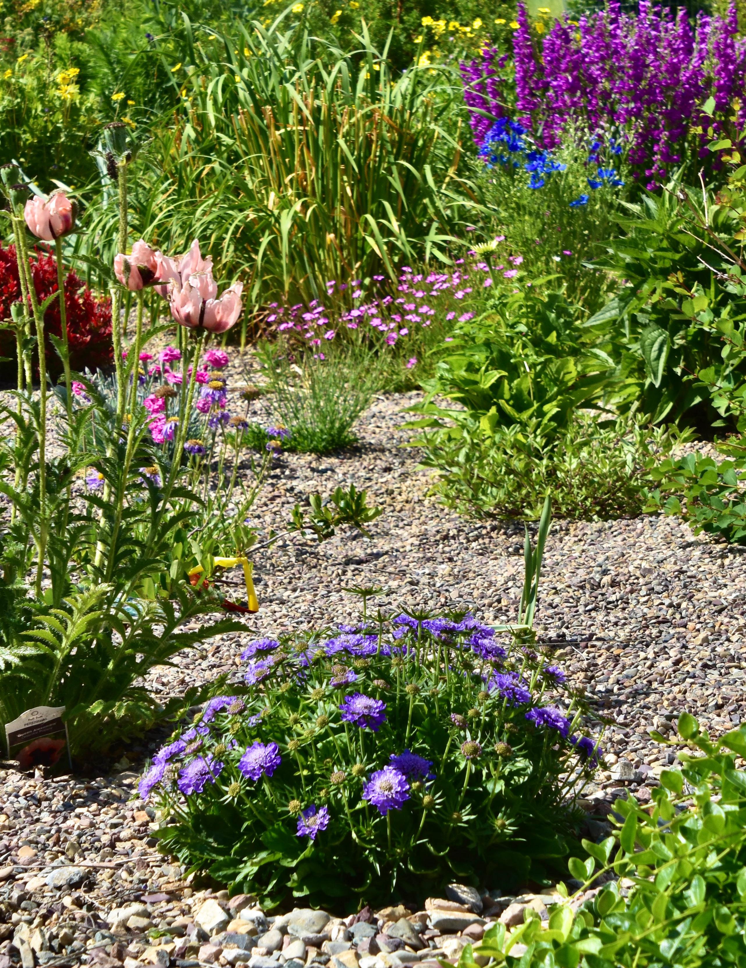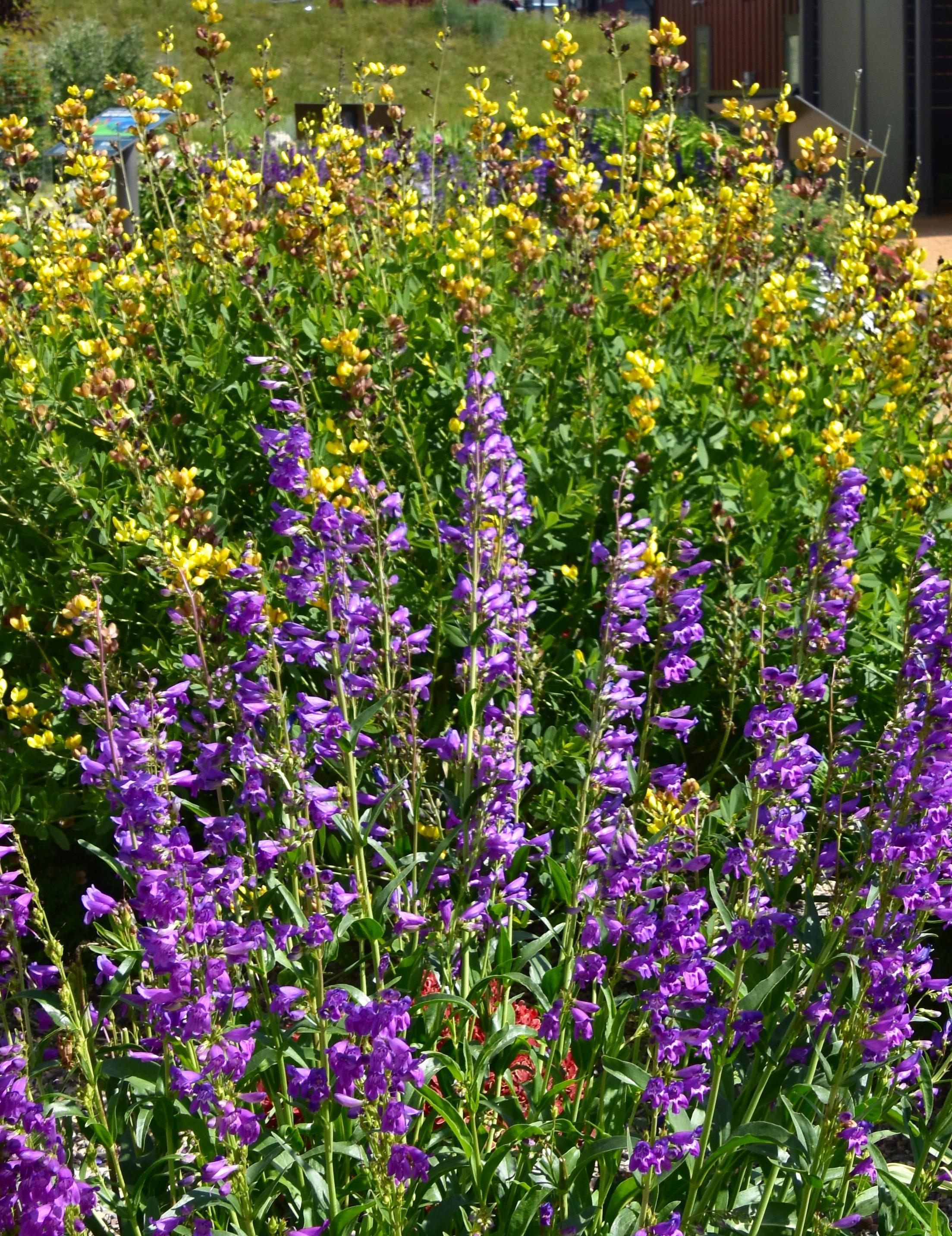 The second garden does not use weed fabric, and the plants are closer together. While this style is typically more attractive to gardeners, the goal is finding a balance between the visual appeal and fire mitigation. Some of the most notable plants in this grouping include blue flax and the impressively huge Canterbury bells.