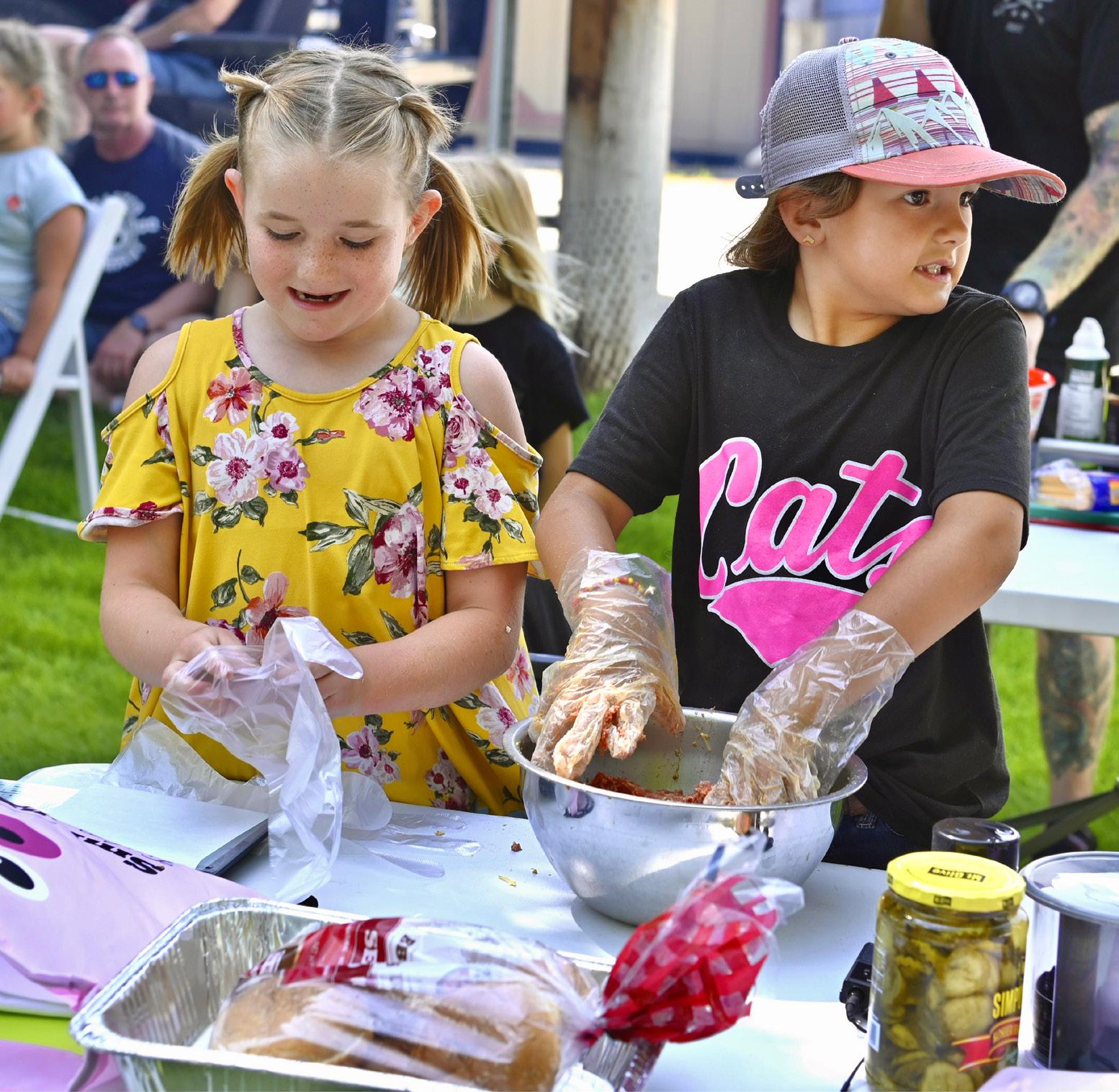 Working as a team, 7-year-old Maisyn Barthelmess and 8-year-old Scotlyn Romaine studied their recipe and transformed regular burger patties into burgers with a “punch.”