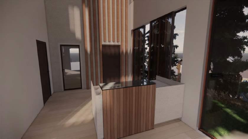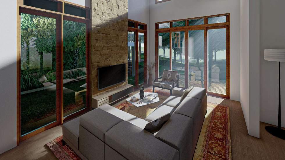 Pada interior ruang keluarga diberikan cukup banyak bukaan yang menghadap ke arah view luar untuk semakin memperkuat konsep pendekatan terhadap alam secara visual sedangkan secara auditori diberikan sentuhan air berupa kolam ikan pada area belakang TV sehingga suara gemericik air dapat bersandingan dengan ruang keluarga. Material yang digunakan untuk interior ruang keluarga adalah kombinasikan antara material kayu dan batu alam.