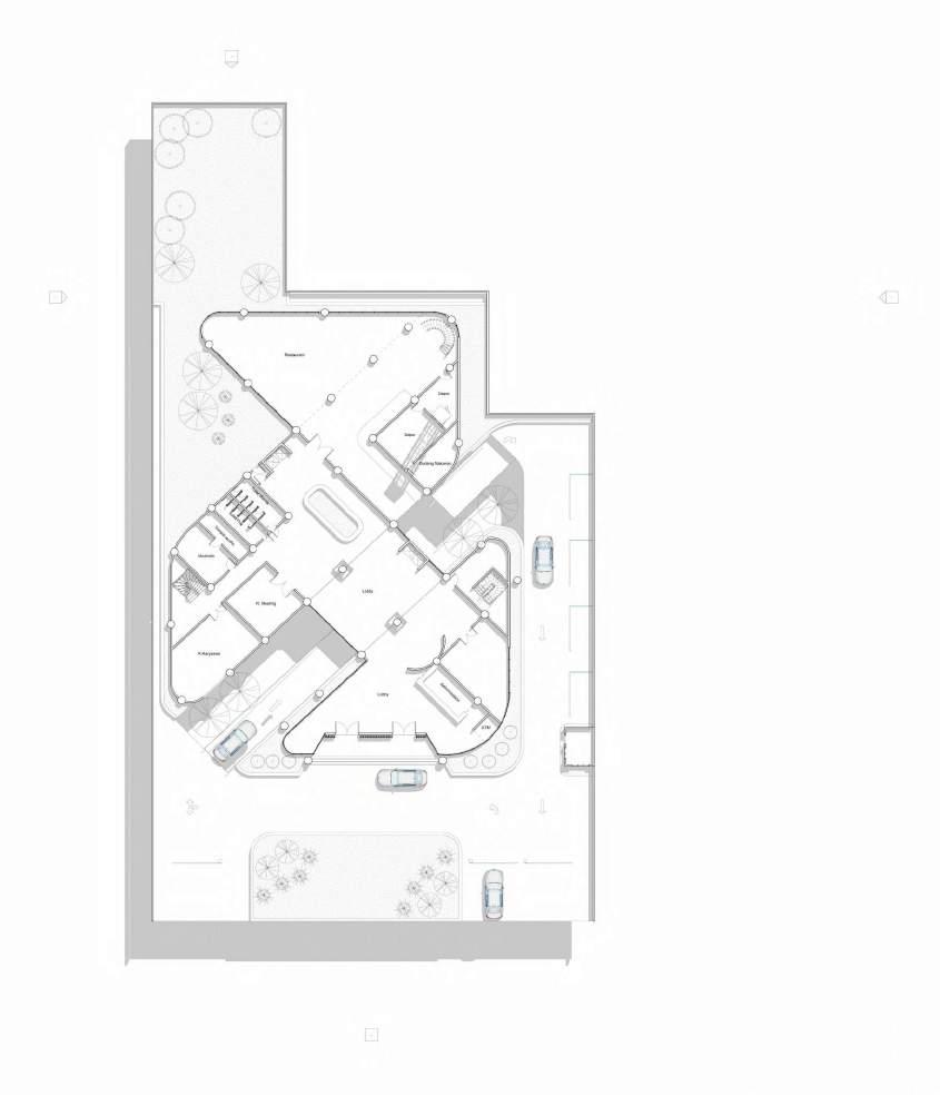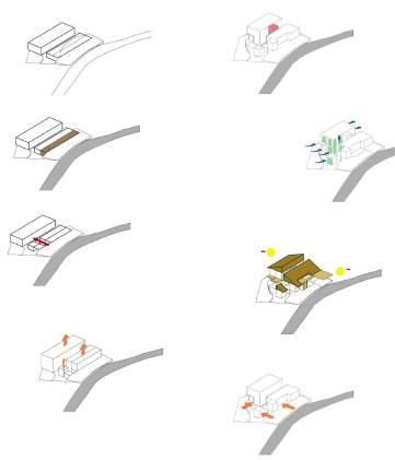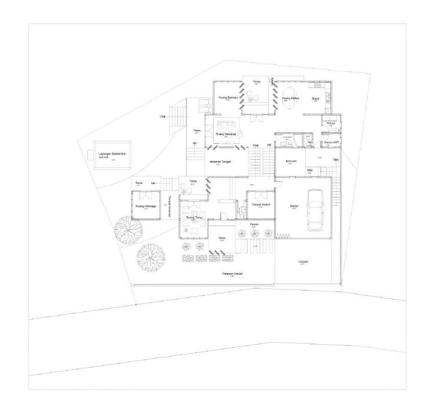 Plotting massa menyesuaikan tapak yang berkontur. Pengolahan tapak menggunakan cut and fill untuk mempermudah aksesibilitas pengguna dan