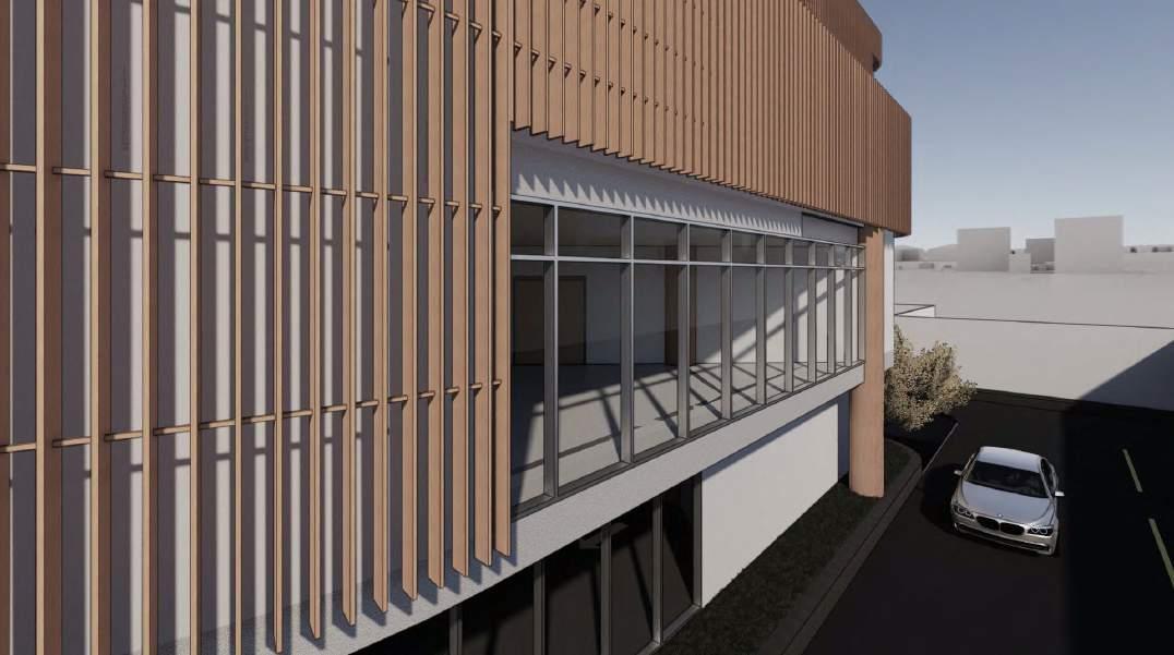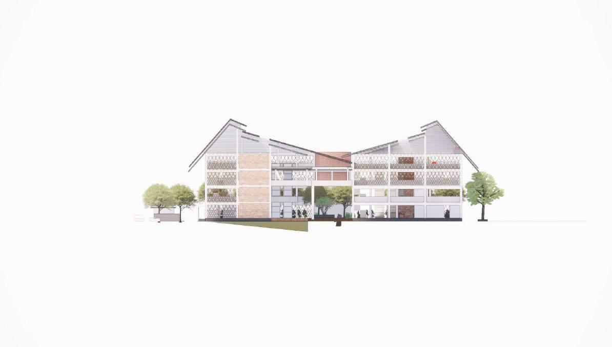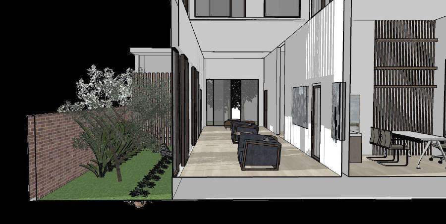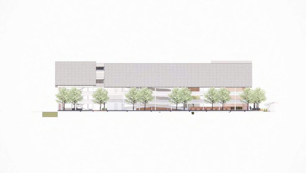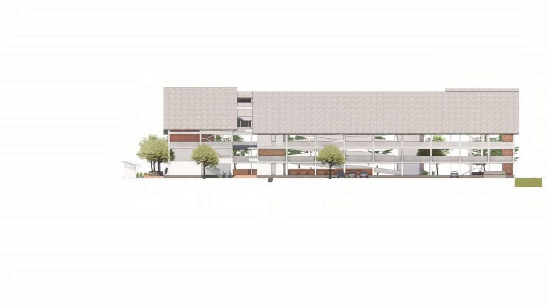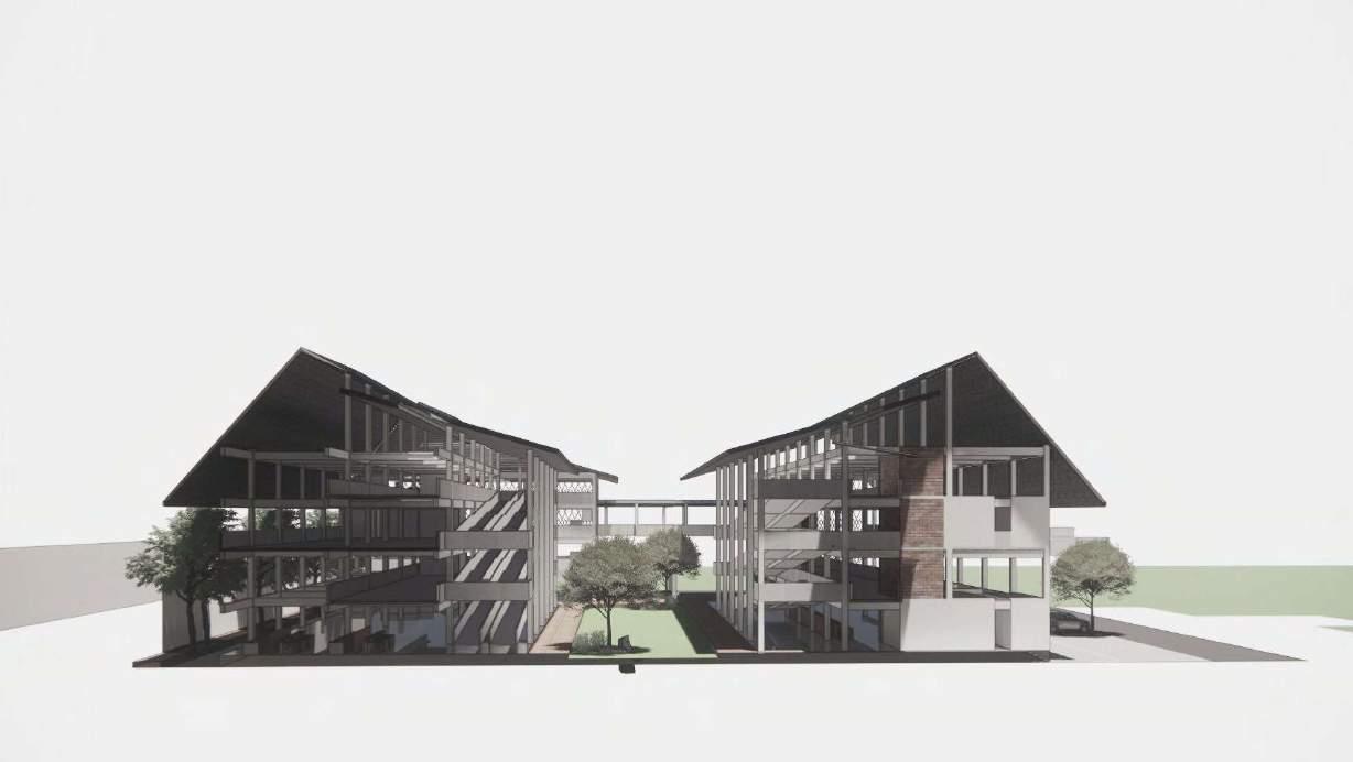 Split pada massa bangunan bagian depan menyesuaikan program ruang dan agar massa bangunan tidak terlalu panjang