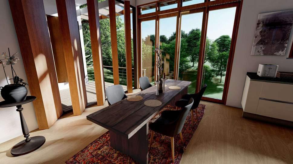 Interior ruang makan didominasi oelh material kayu pada furniture, kusen maupun penggunaan vinyl dengan teksture dan warna kayu. Area ruang makan langsung menghadirkan pemandangan halaman belakang, Pada antara ruang makan dan teras terdapat kisi yang dapat fleksibel untuk dibuka dan ditutup sesuai kebutuhan pengguna, fungsi kisi tersebut untuk menambahkan pencahayaan dan sirkulasi dalam ruangan.