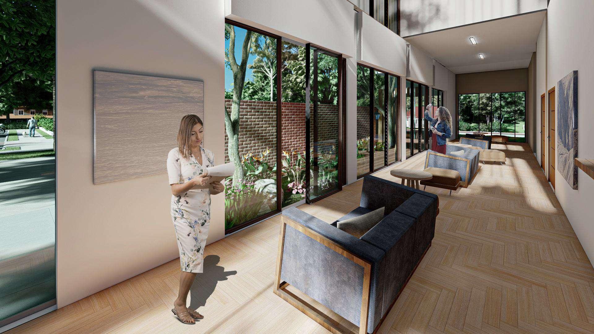 Interior ruang tunggu didominasi oleh material kayu yang dikombinasikan dengan warna abu-abu muda dan tua pada furniture. Area ruang ini langsung menghadap ke arah Timur yang terdapat taman, jadi dapat terkena cahaya matahari pagi. Pada bagian atas ruang juga terdapat void jadi sirkulasi dan pergantian udara diharapkan dapat mengalir dengan baik, karena pada tempat inilah sebenarnya rawan terhadap penyakit-penyakit yang menular. Kursi tunggu dipilih menggunakan sofa dan kursi berbusa supaya lebih nyaman.