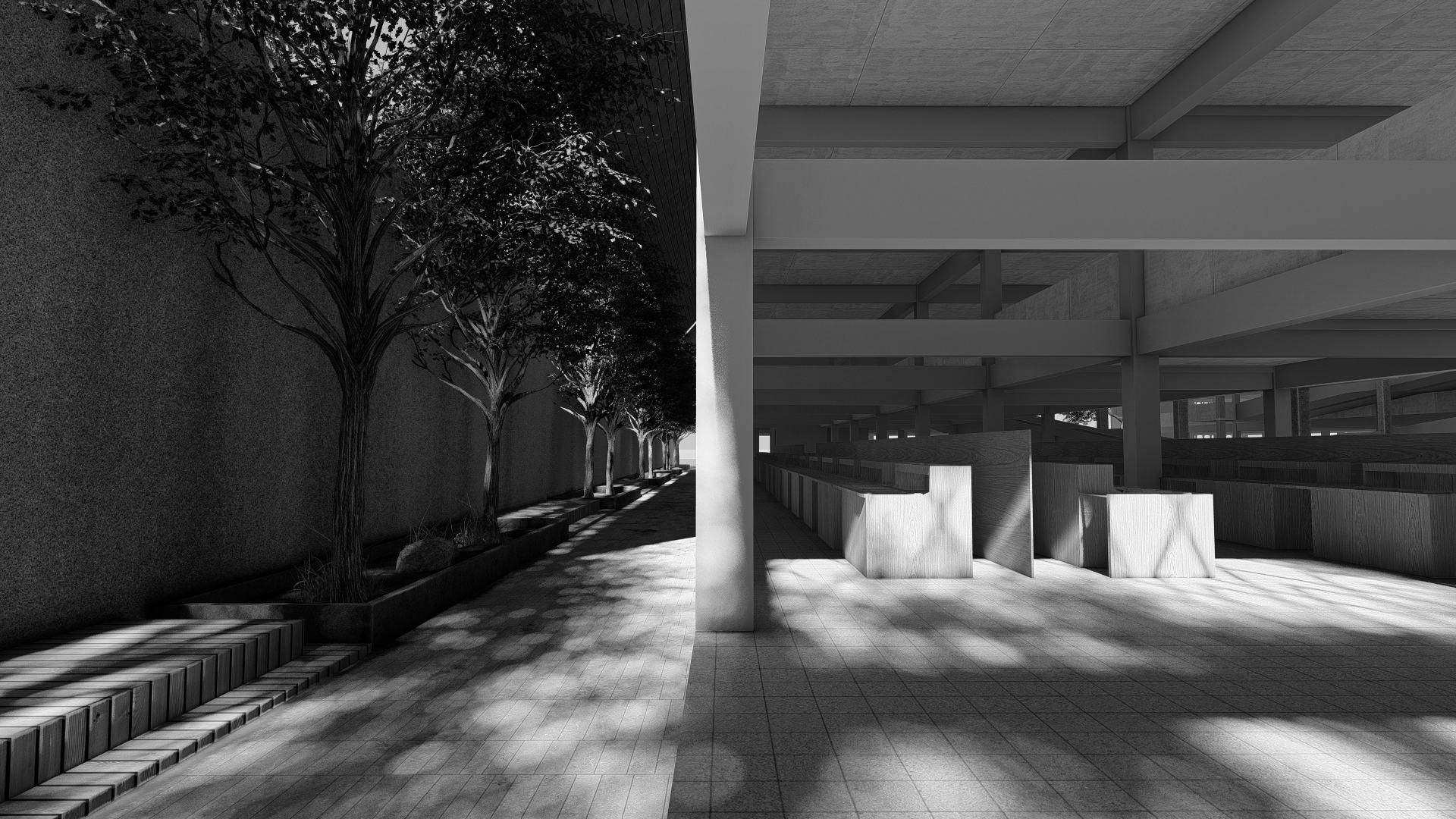 Skylight membantu memasukkan cahaya alami, selain itu adanya stack effect pada courtyard