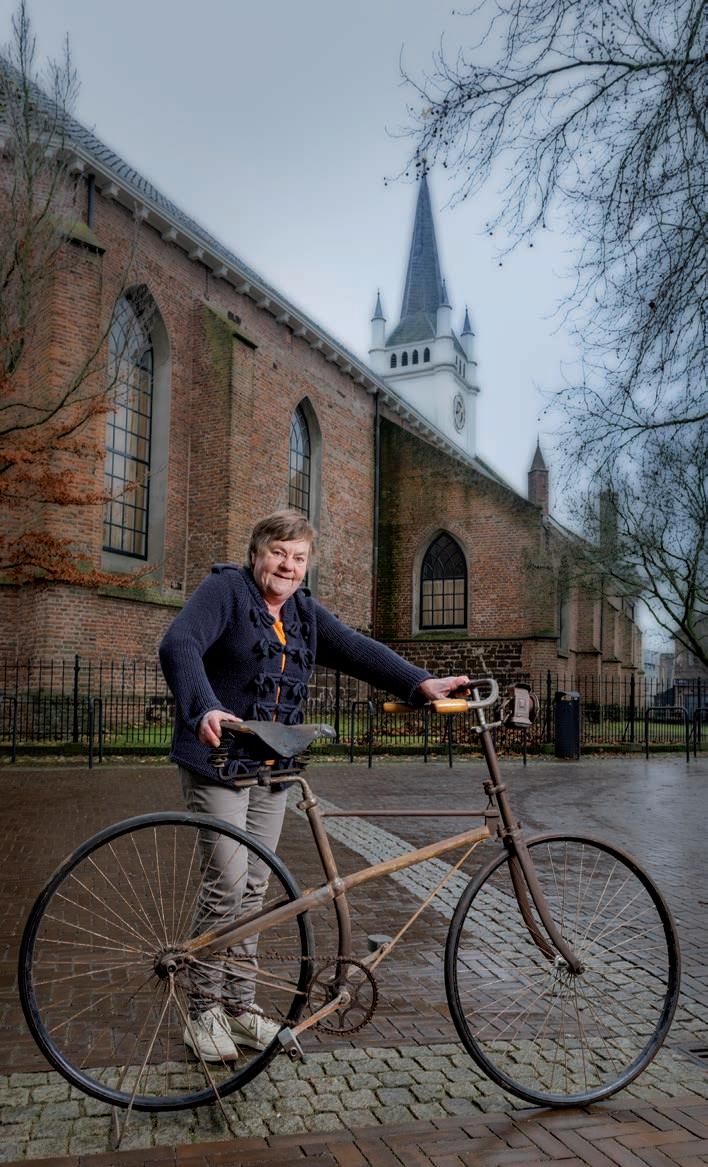Oude tijden herleven zou Jules Deelder uitroepen bij het zien van de oude collectie oer-Hollandse fietsen die het Historisch Rijwielmuseum in Ommen herbergt. Sinds de drie initiatiefnemers Anton Wolters, Arie Broekmaat en Jan Koggel in 2017 besloten om een 20-tal verzamelde fietsen in een leegstaand pand in Ommen onder te brengen, weten steeds meer mensen de weg naar het museum te vinden. Vorig jaar waren dat er al 4.200, vertelt Dineke Broekmaat, bestuurslid van het Historisch Rijwielmuseum. De bijzondere verzameling omvat volgens haar inmiddels meer dan 100 uiteenlopende exemplaren en bestrijkt de periode van 1885 tot en met 1980. Er staat zelfs een oude werkbank met onder andere een wielrichter en oud fietsgereedschap. Broekmaat: ‘De collectie beperkt zich overigens tot fietsen met maximaal drie versnellingen. Een unicum is een exemplaar met het versnellingssysteem in de achteras; de Union 2versnellings terugtraprem. Door terug te trappen schakelt de fiets naar een andere versnelling. Een andere ware eyecatcher betreft deze ‘Safety fiets’ die kinderen in een schuur op de Veluwe hebben ontdekt. Deze fiets uit 1885 komt in de evolutie na de hoge bi en de loopfiets en is eigenlijk de eerste fiets die lijkt op de hedendaagse exemplaren. Hij heeft nog massieve banden en ook het frame is nog massief en niet hol zoals tegenwoordig. Als verlichting dient een olielampje aan de voorkant. Dat voldeed prima, want auto’s reden er toen nog niet. Het echte gouden tijdperk van de fiets brak trouwens pas een paar jaar later aan toen Dunlop de luchtband uitvond.’ Speciaal om groepen schoolkinderen te ontvangen is er in het museum een aparte educatieruimte ingericht waar zij bijvoorbeeld uitleg krijgen hoe een dynamo werkt en na de rondleiding zelf buiten kunnen rijden met een handbike of met de ‘vliegende Hollander’ uit 1900 die vooruitkomt en stuurt door een hefboom te bewegen. Verder organiseert het museum historische fietstochten. Zo wordt in april een thema expositie ingericht over ‘80 jaar bevrijding’ en vindt op 11 en 12 april de Tweede W.O Fiets Toer plaats. Het museum is van 1 april t/m eind oktober geopend. Zie voor meer info: https://www.fietsmuseumommen.nl/ of Facebook: Historisch rijwielmuseum Ommen. ●