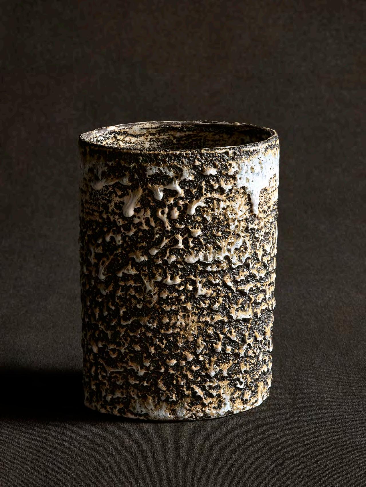 While recalling the functionality of his earlier production ware, from the 1980s onwards, these forms also offered accessible interior and exterior surfaces on which to display nuance –where glaze might pool, run, or gather, always suggesting its liquid origins. These vessels carry the testimony of his hand, while their hues and cratered forms recall cracked tarmac, roadmarkings, or the sparkling lights of the London skyline. In this sense, they stand not only as objects of containment, but as vessels of lived urban experience. It is paradoxically within their apparent imperfections that we find meaning, marking Cooper’s departure from a more utilitarian tradition. Where he considered the crawling of a glaze to be excessive, he would sometimes repair it with a gold lustre spot after firing [as with fig. 3]. This act recalls the Japanese tradition of Kintsugi, whereby one simultaneously covers yet highlights the fault. In quoting the textures and tones of the metropolis, Cooper’s pots embody the material presence of London itself, the unpredictable nuances of his medium, and the idiosyncrasies of the hand and mind that made them.