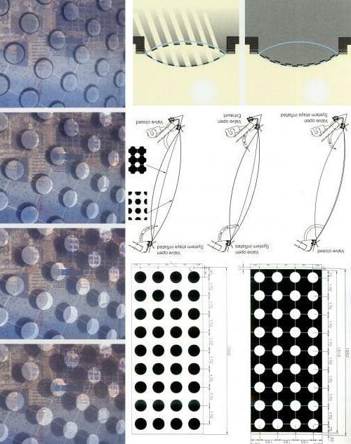 Te south facade of the Barcelona Media-Tic building has a very interesting solar protection. Tis is an outer layer separated from the curtain wall by the spatial metallic structure. It is composed of triangular elements, each one consisting of two layers of ETFE, which are kept separated and in fated by the pressure of the air inside. Between these two layers there is a third one, which can move manipulating the air pressure.