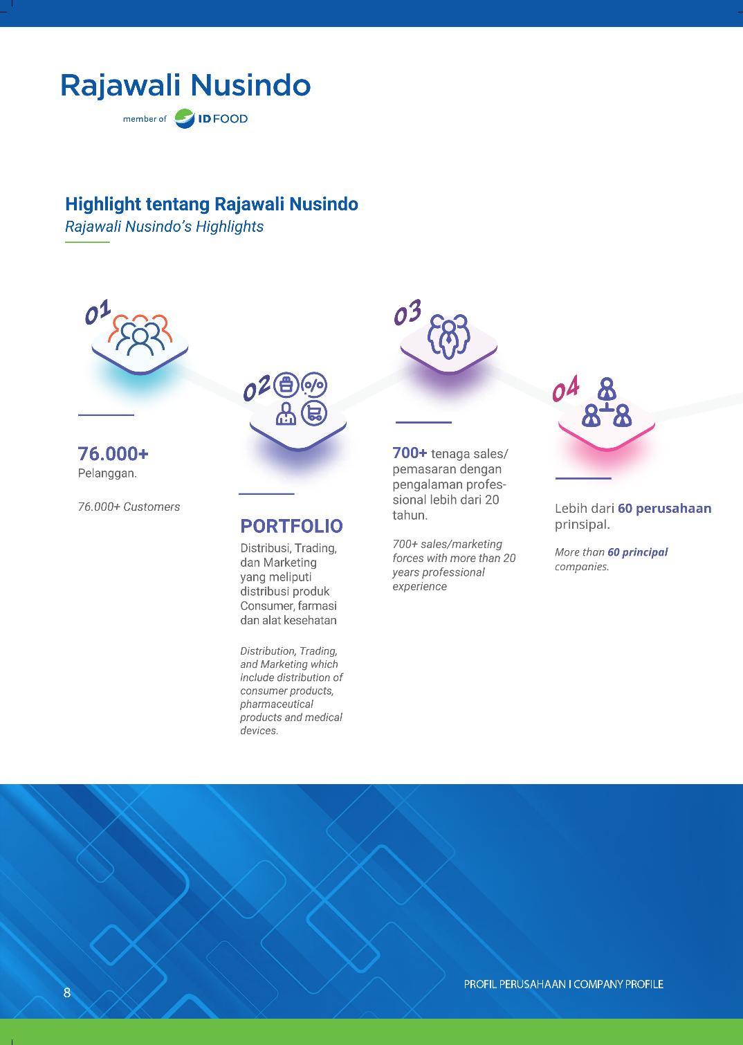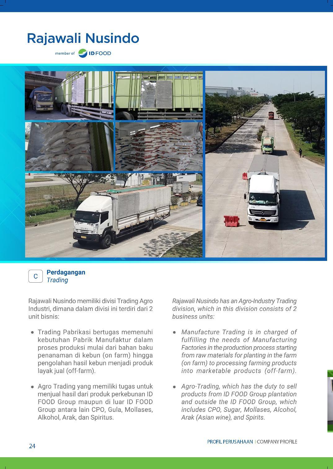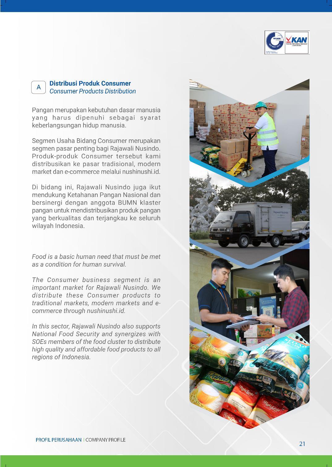 Sebagai anak perusahaan PT Rajawali Nusantara Indonesia (Persero) yang bergerak dalam bidang distribusi dan perdagangan, PT Rajawali Nusindo terus berupaya menyalurkan produk konsumsi, alkes, produk farmasi, hasil perkebunan, serta alat dan sarana perkebunan unggulan.