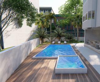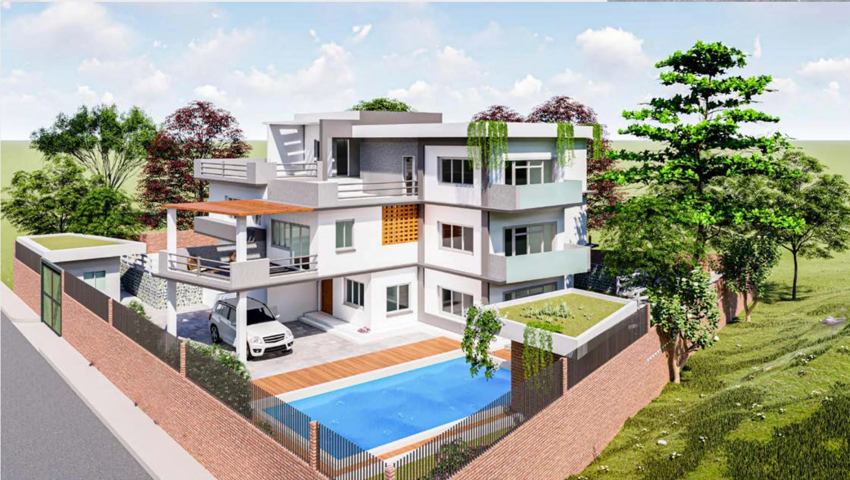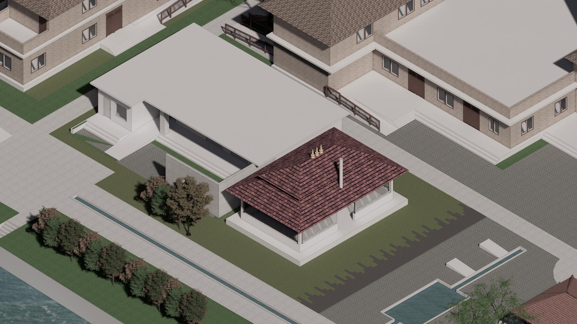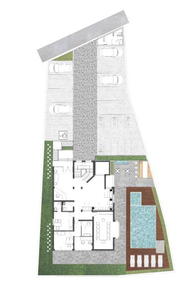 To make the building accessible, the provision of ramp in the ground floor and lift was added. An accessible parking unit has also been incorporated in the parking design. The ground floor includes administration. The upper floor accommodates the hotel rooms while the kitchen and dining are planned in the basement. From basement, we can access to outdoor bar and swimming pool which are designed in the tropical theme. The palm trees and other tropical plants contribute to enhance the landscape.