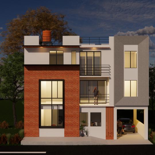 According to the client’s requirement, the front façade was to be designed playing with the depths and volumes. But the issue was that considering the Setback of 5 feet, the volume could not be projected out much. As the client was determined to achieve his demand, I experimented the façade treatment with projections with minimum depth but also incorporated the inclined lines to give the required effect. I also used different textures to create variations in the volumes.The balcony also serves to contribute to the façade treatment.