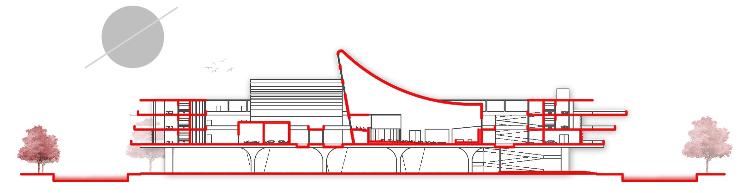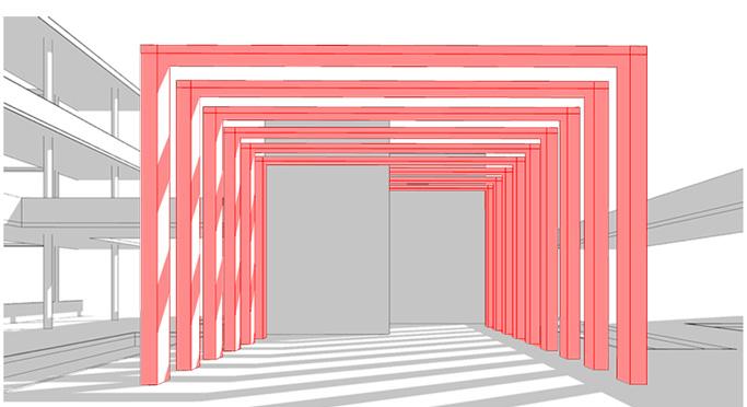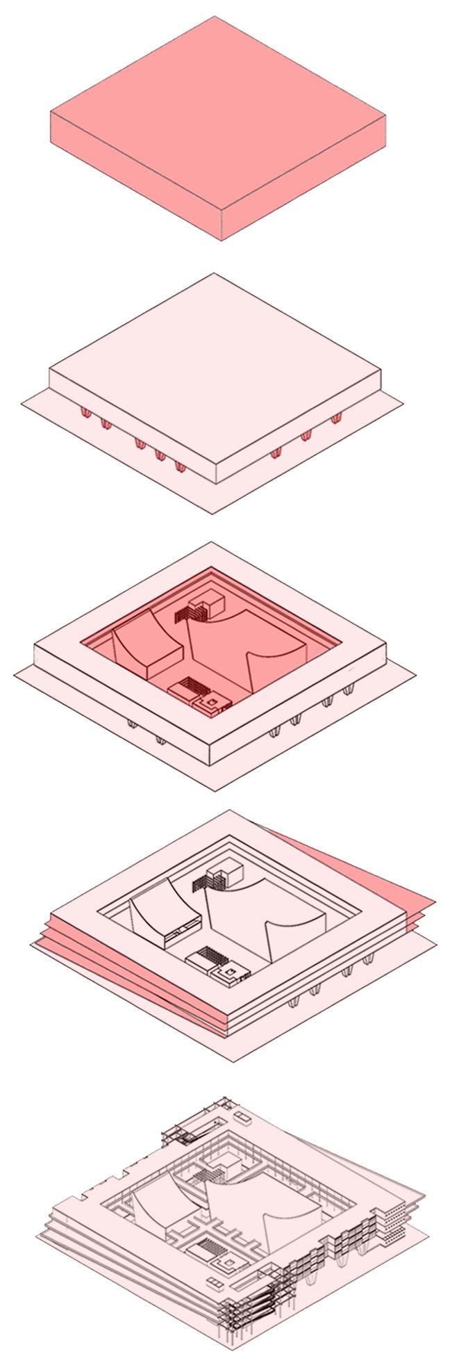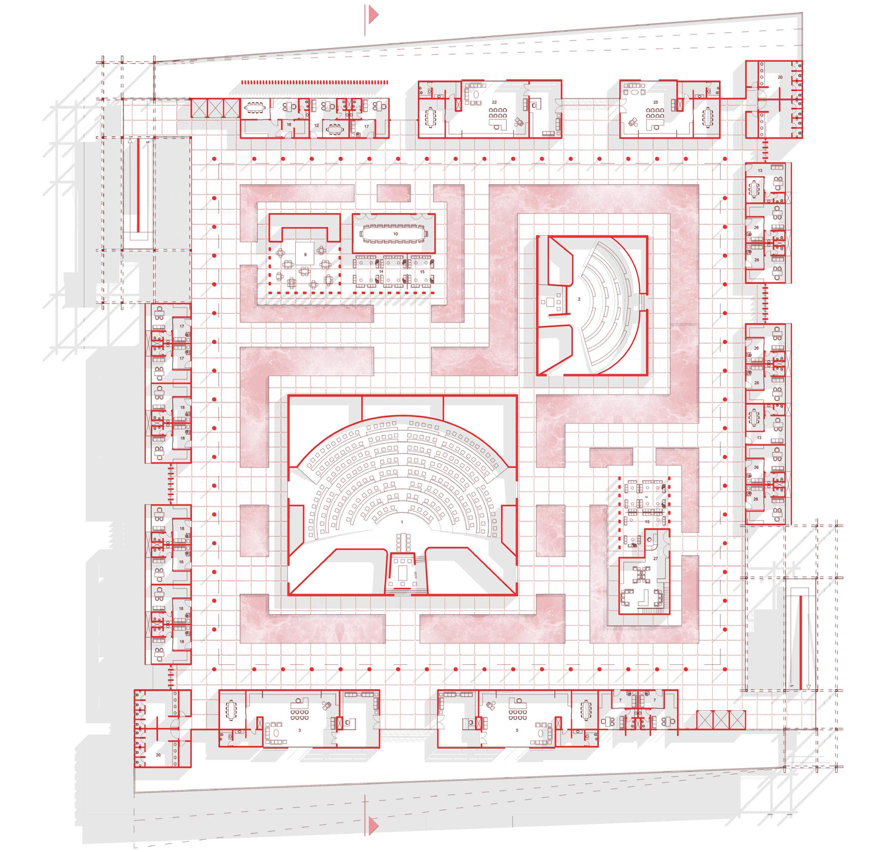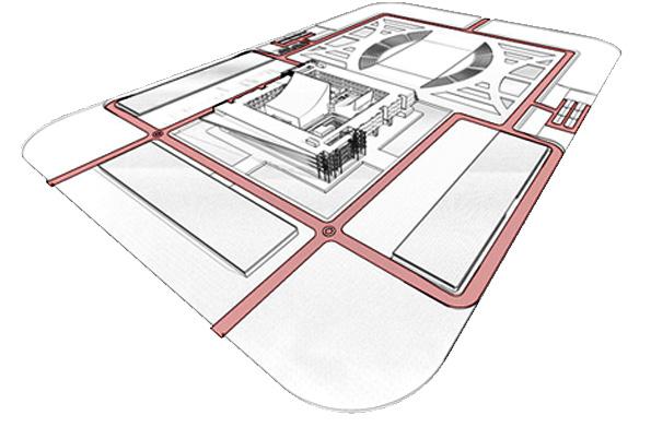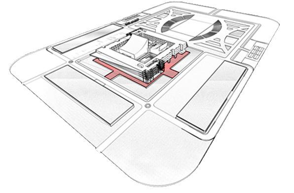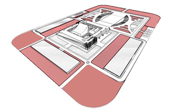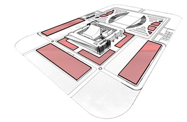 Lightening the overall structure, with a open piazza in the center housing the core functions.
