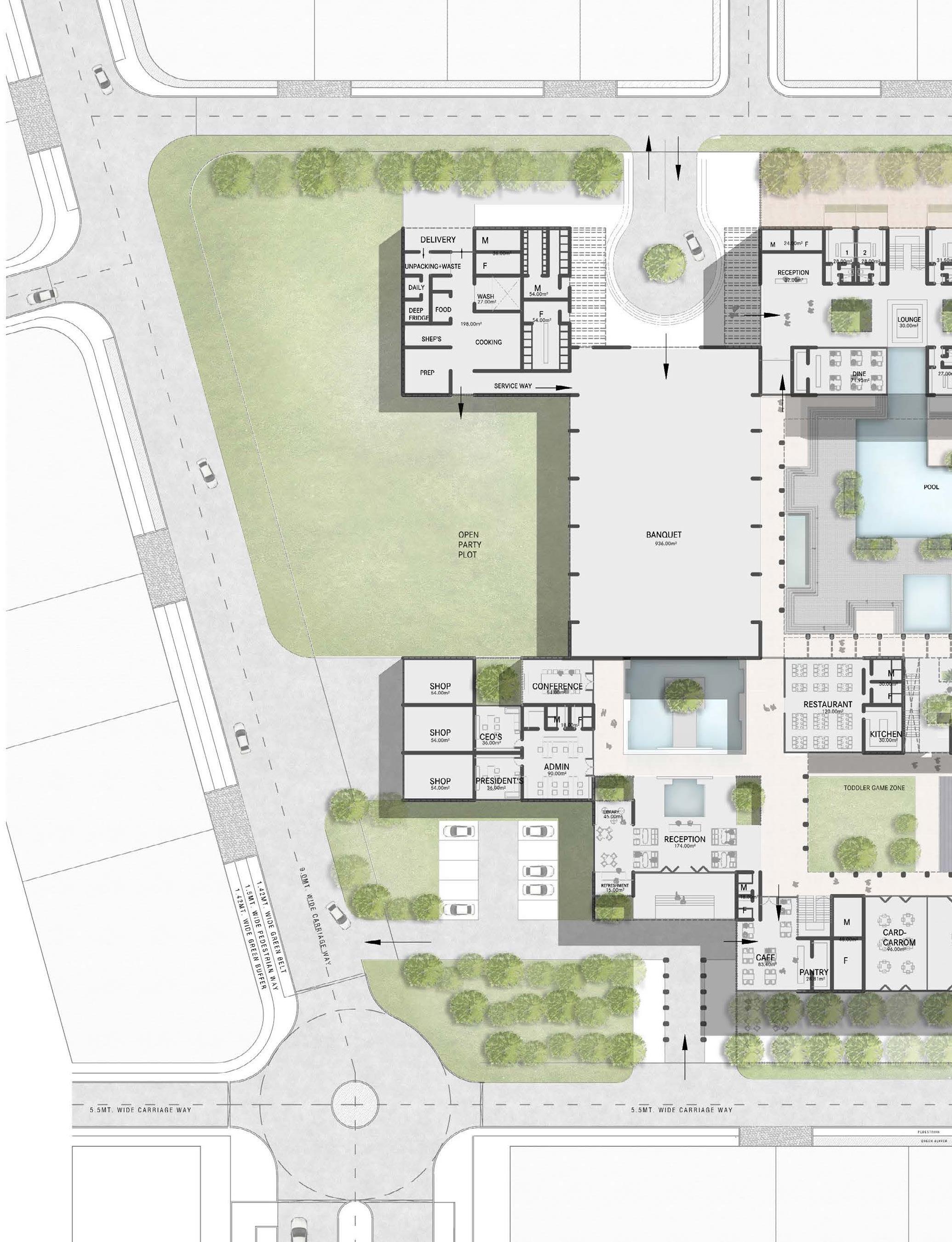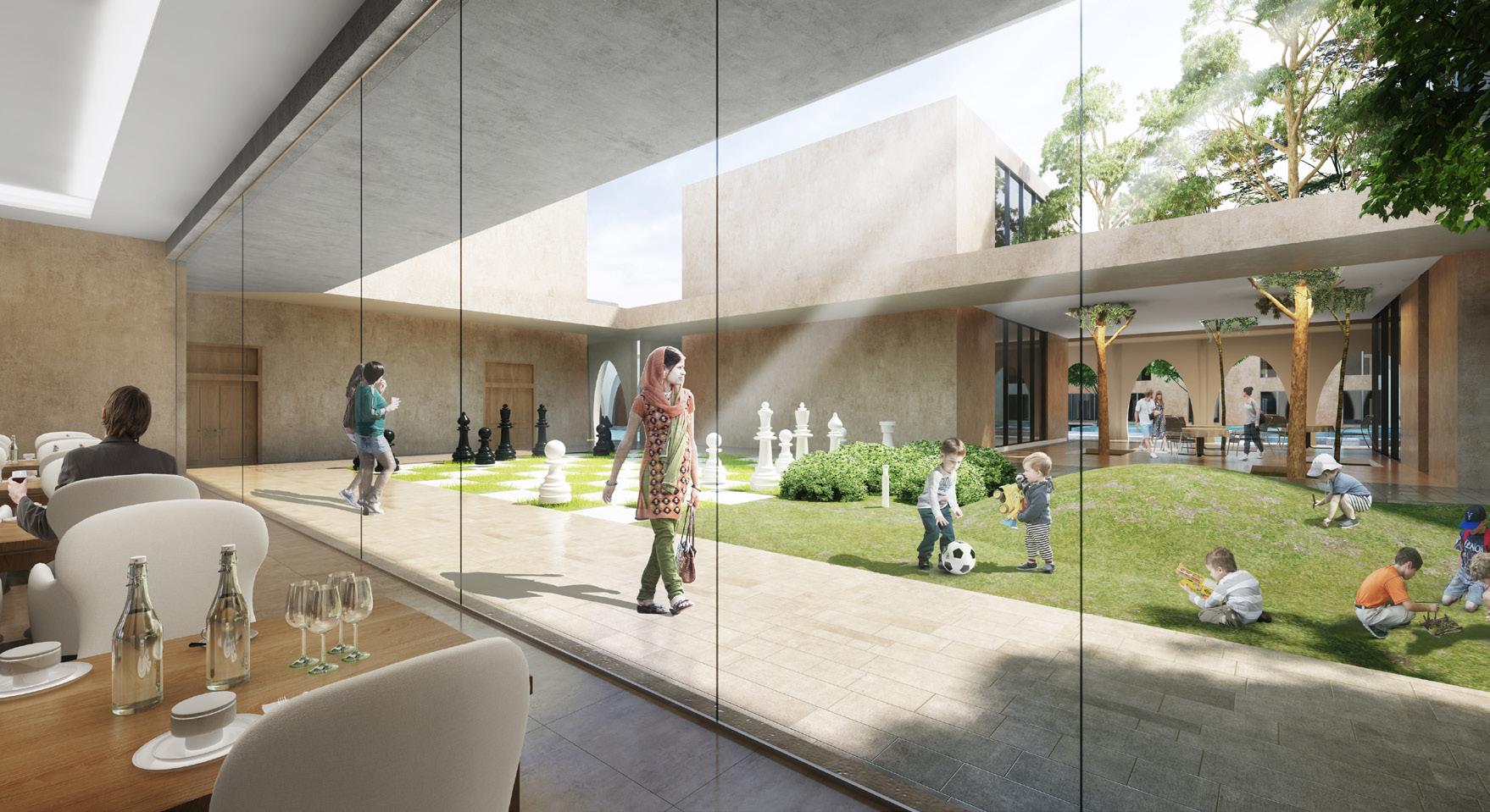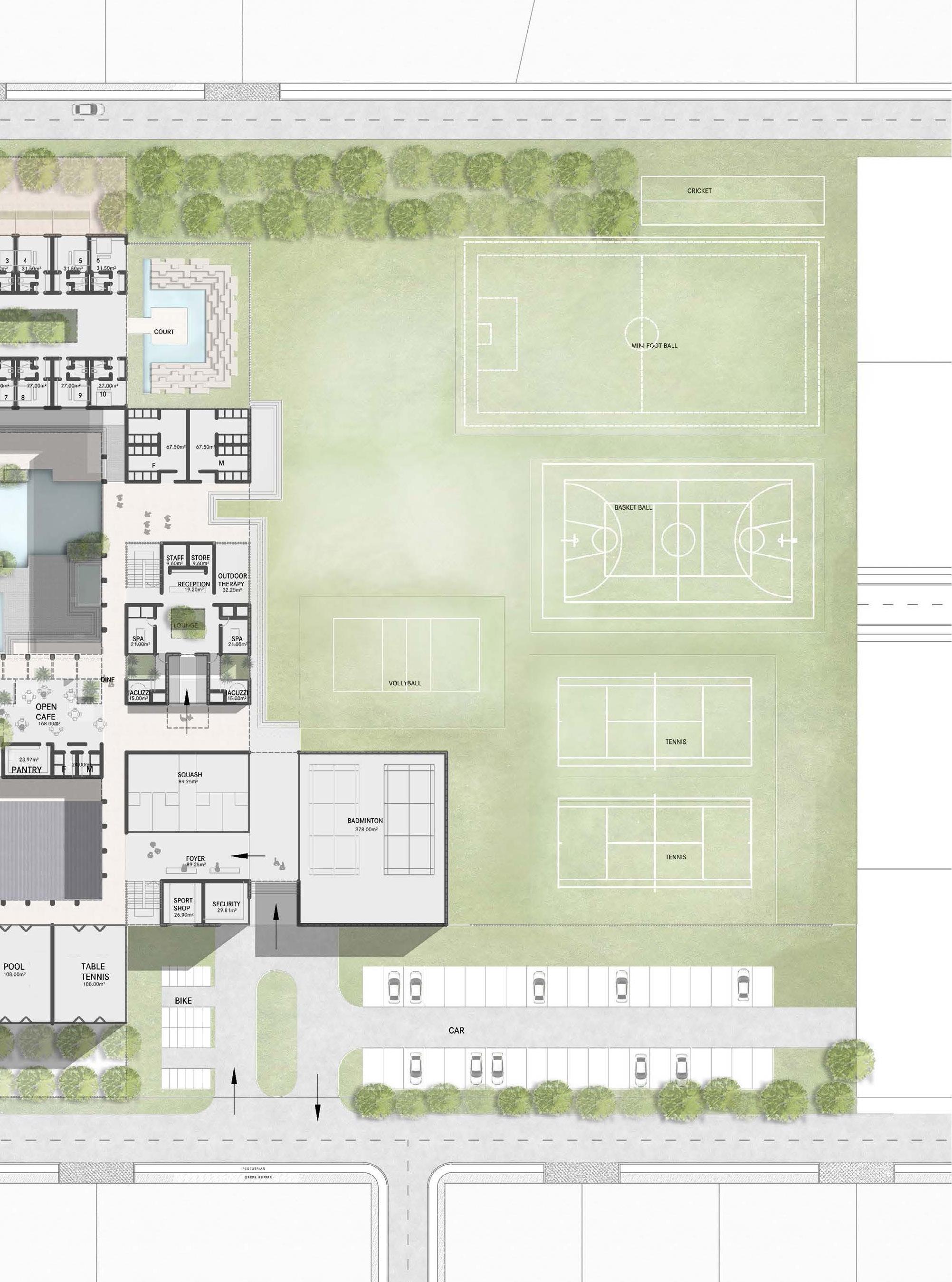 The activities in the clubhouse are not just limited to internal spaces but are expanded to open landscape areas as well. The relationship between inside and outside is carefully maintained by having multifunctional courtyards.