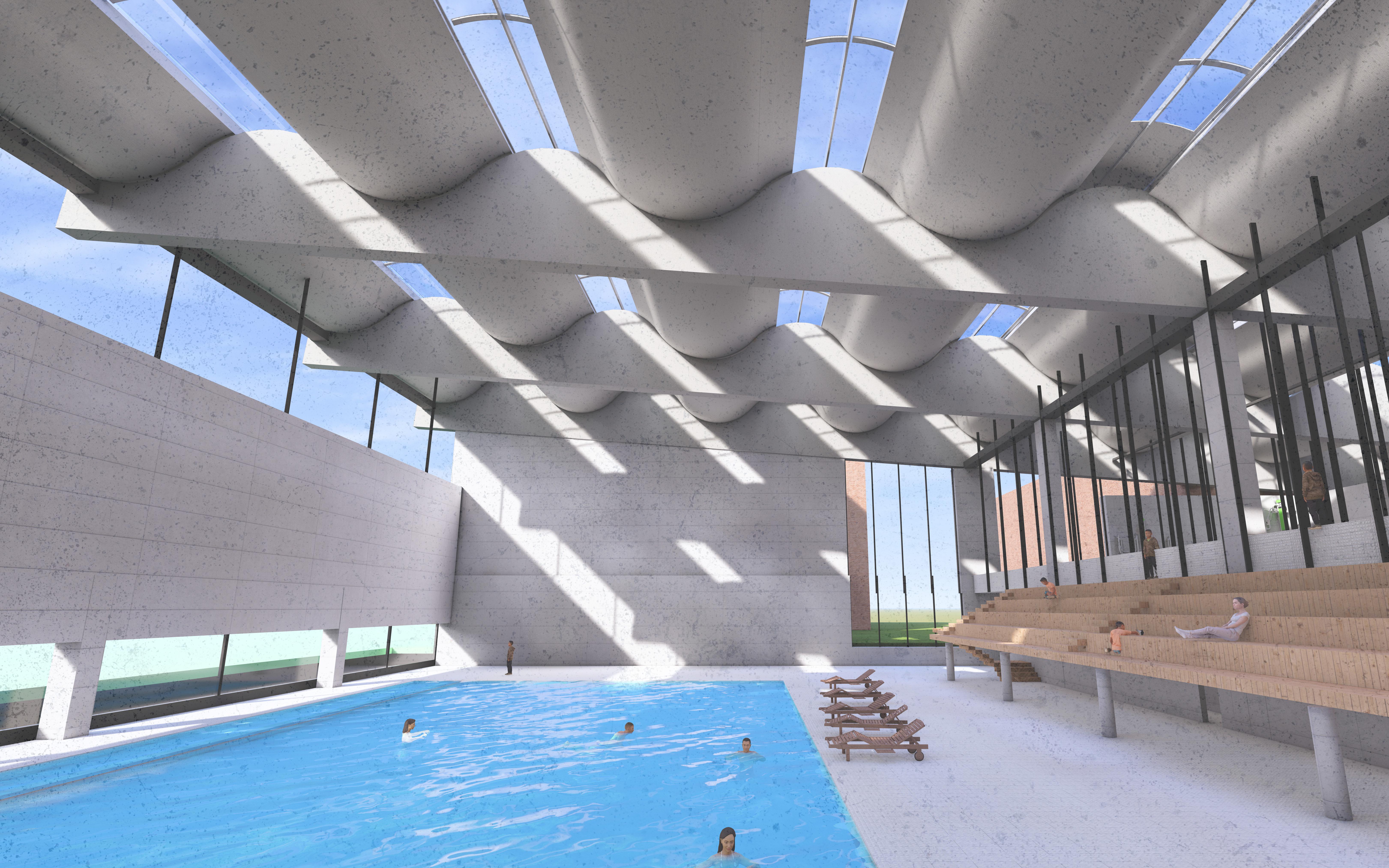 The roof garden enhances sustainability, wellness, and urban integration by providing a green retreat with native plants, seating areas, and energy-efficient features that complement the aquatic center’s design.
