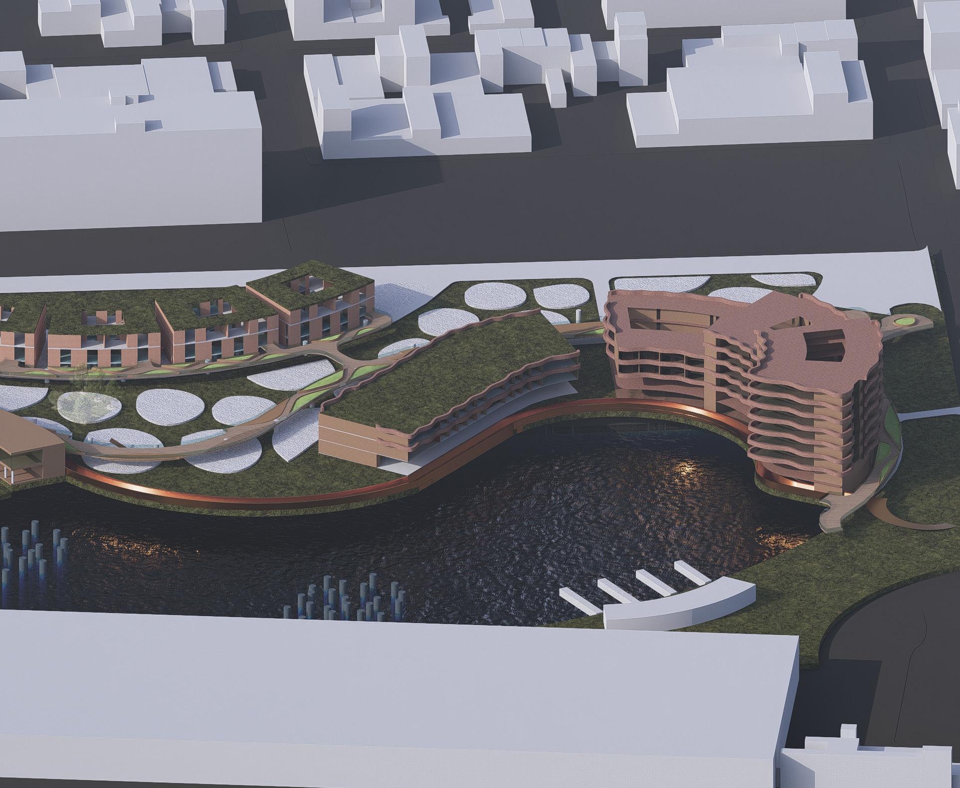 This studio project focuses on affordable housing in Red hook, Brooklyn, by integrating sustainable design with the neighborhood’s industrial history. The design elevates the housing on a steel platform to mitigate flood risks while freeing up ground space for public areas. Mixed-use spaces, such as local businesses, co-working hubs, and community centers, foster economic growth and social interaction. The project incorporates sponge landscapes and oyster farming to enhance environmental resilience. Green spaces throughout the site promote well-being and ecological balance. Buildings are strategically placed to connect the street and waterfront, revitalizing urban engagement. Ultimately, the project creates a vibrant, inclusive community that balances sustainability, heritage, and climate resilience.
