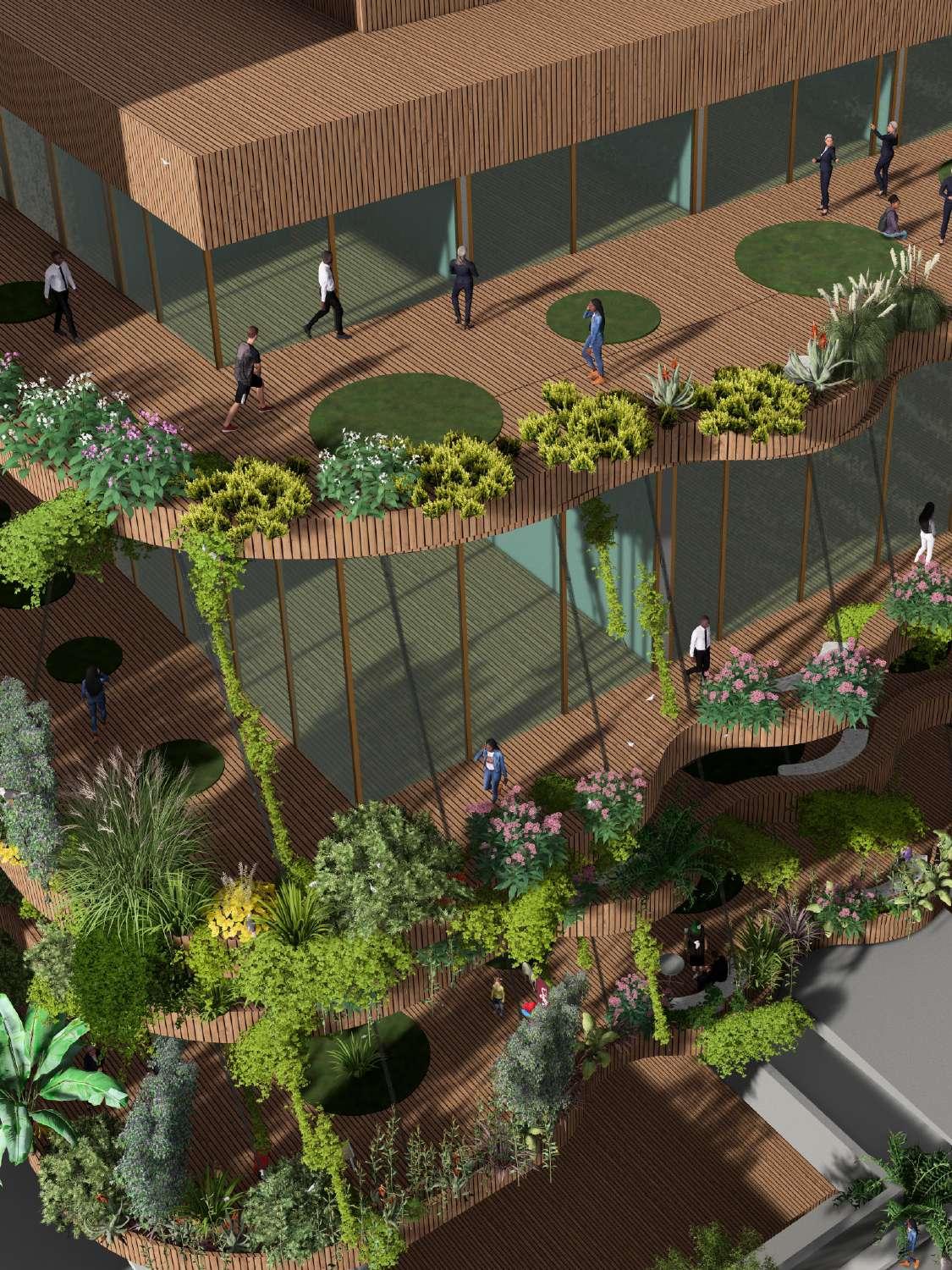 The proposed façade design for the Whitney Museum draws inspiration from the surrounding neighborhood’s artistic and architectural diversity, aiming to create a climate-responsive, visually dynamic, and sustainable structure. Expansive glass panels replace traditional exterior walls, enhancing transparency, natural light, and a connection to the environment. A multifunctional platform serves as a recreational space, while vertical green facades allow for seasonal transformation, offering a living, evolving aesthetic. The use of wood and Corten steel adds tactile contrast, enriching the building’s visual appeal. Rainwater harvesting on the platform sustains the green facades, contributing to environmental sustainability. This design seeks to blend artistic expression with functionality and ecological responsibility, enriching both the architectural experience and the urban landscape.