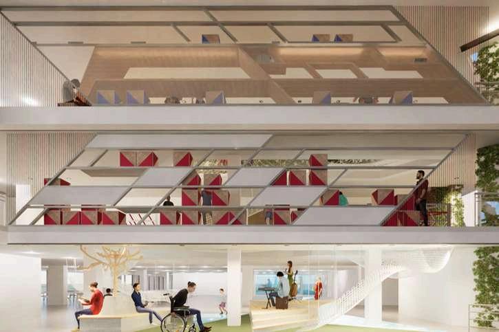 mix of activities, least control central opening between level 1 & 2 brings visual attention upwards active programmes quieter programmes