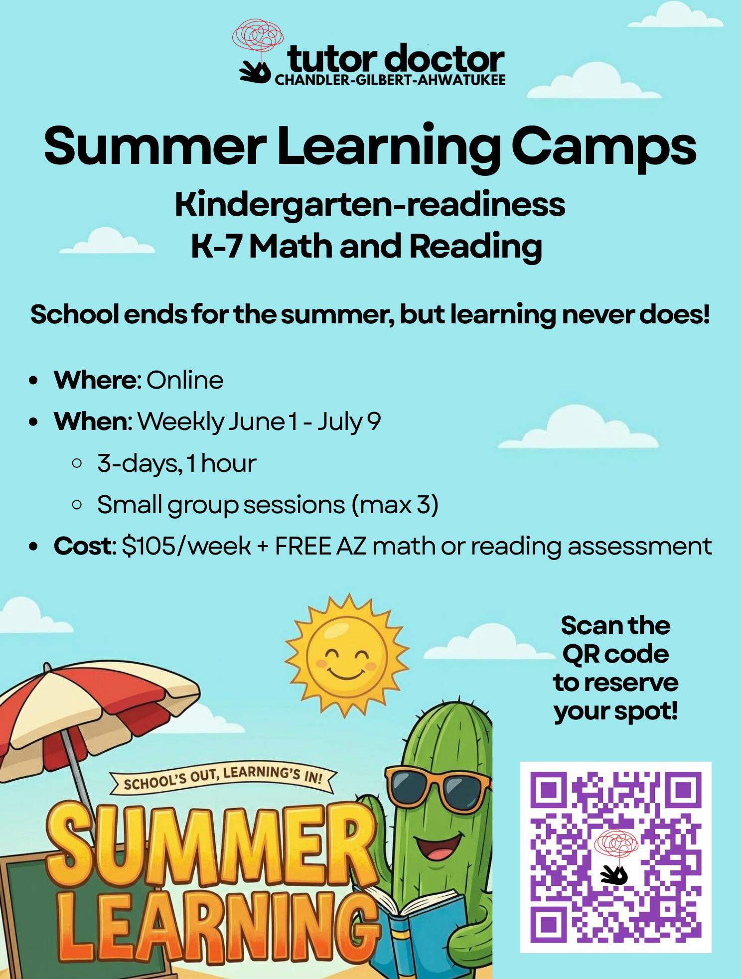 Tutor Doctor is hosting Summer Learning Camps for Kindergarten-readiness and K-7 Math and Reading! School may be out, but learning never stops. Sessions run online weekly from June 1 through July 9, three days a week for one hour per session, in small groups of no more than 3 students. At $105 per week, each registration includes a free AZ math or reading assessment.
