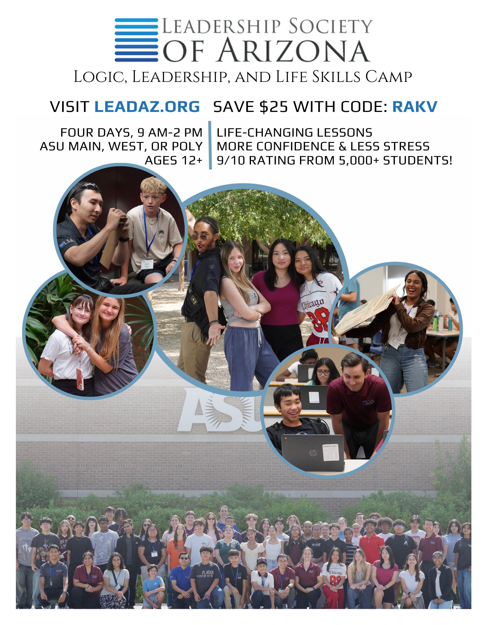 Logic, Leadership, & Life Skills Camp for ages 12+. Happiness is the goal for this one-of-a-kind youth camp! Leadership Society of Arizona’s 2026 Logic, Leadership, and Life Skills summer program is a day camp where teens complete licensed professional development training. We’ve taken a college-level curriculum and turned it into a fun and interactive 4-day course. Students will set new goals, learn proven leadership skills, and get individualized attention from our certified teen life coaches. Get $25 off with promo code: RAK.