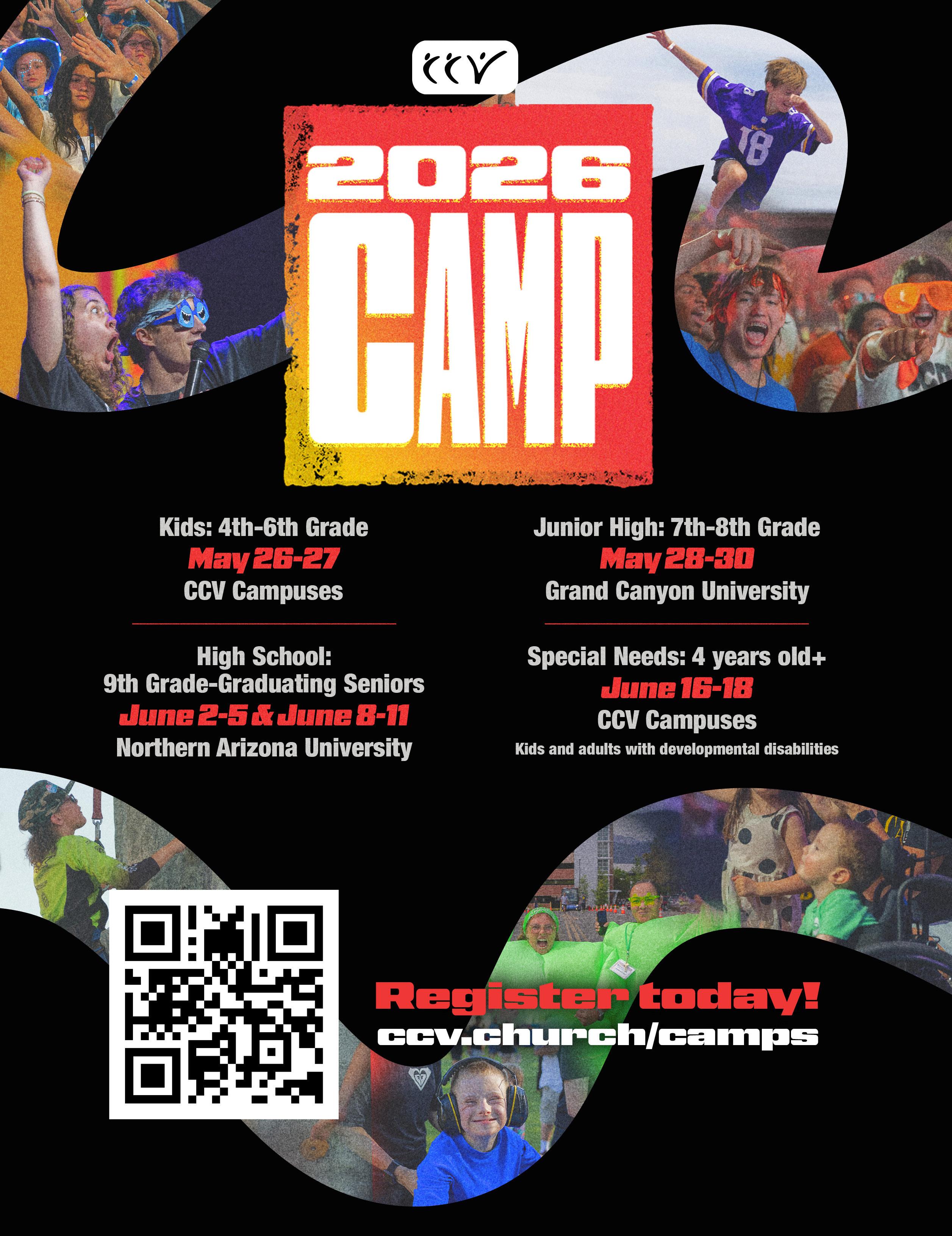 • CCV Jr. High Camp: incoming 7th–8th graders and takes place at GCU on 5/28–5/30.