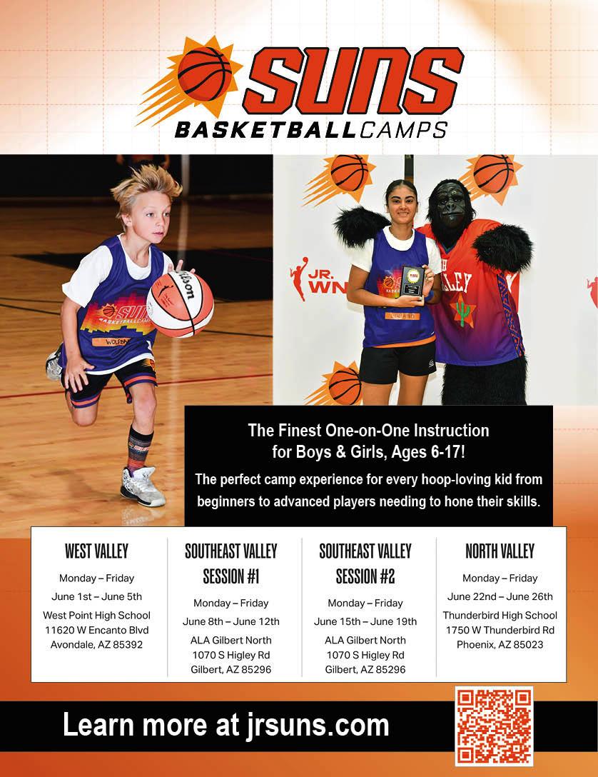The finest one-on-one instruction in a safe, positive atmosphere for boys and girls, ages 6-17. It's the perfect camp experience for every hoop-loving kid from beginners looking to learn about the game to advanced players needing to hone their skills. Learn all about the "ins" and "outs", the tips and tricks, the drills and skills that can help any youngster love this game even more! Personal attention from experienced coaches under the watchful eye of a certified athletic trainer... everything you would expect from a Suns Basketball Camp and more!