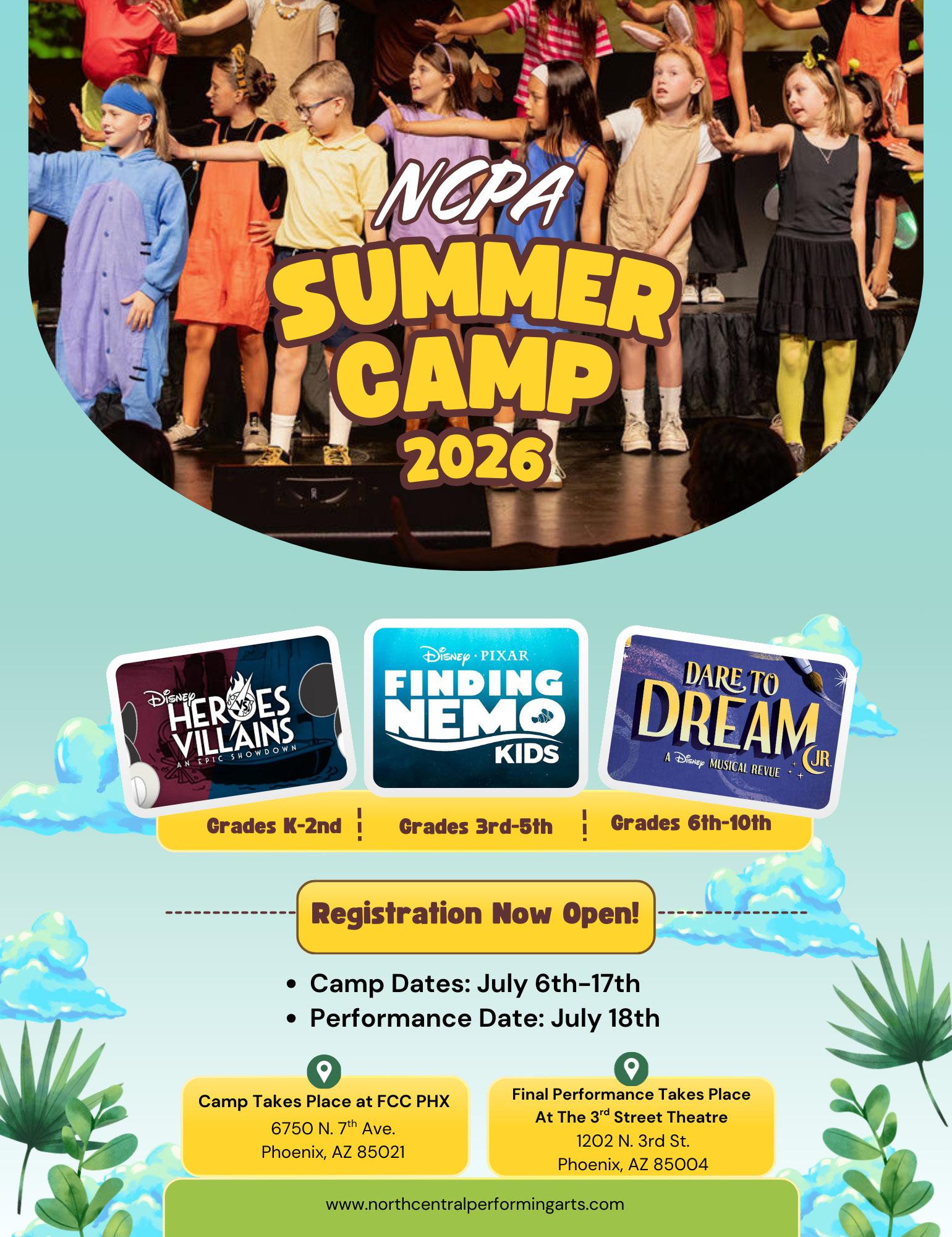 Three age-specific programs, each running for two weeks and culminating in a final performance: Kinder–2nd Grade (Disney Heroes & Villains): A high-energy introduction to musical theater focusing on Disney hits, storytelling, and dance. 3rd–5th Grade (Finding Nemo Kids): Students rehearse and perform the beloved underwater adventure, building performance skills and teamwork. 6th–10th Grade (Dare to Dream Jr.): A Disney-themed showcase where older students collaborate to perform an uplifting musical focused on courage and kindness. July 6th-17th.