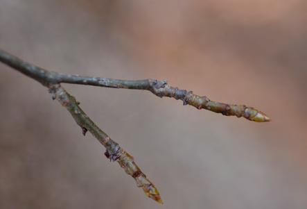 11b Branches brown-gray, stout (05-1 cm), with no corky ridges New twigs and buds are hairy (velvety) Buds are few-scaled (including the terminal one) that often have ridges running down their sides; leaf scars are heart-shaped or shaped like monkey faces, (05-1 cm across)