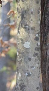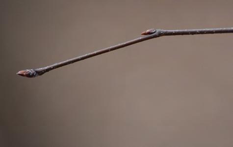 7b Bud scaly, not two-sided, sides relatively straight, ending in a sharp elongated point (bud more than 4X longer than wide); bark looks smooth (usually without ripples or streaks) and gray, but feels rough; dead leaves often stay on the tree in winter (like in oaks, as this is in the oak family)