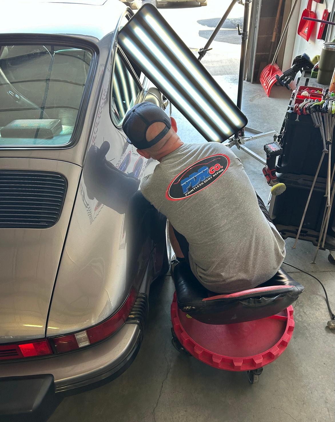 Think of the numerous types of metals used on cars. Our beloved marque has, in Eric’s opinion “stubborn” metal, esp. the steel of my 911’s generation. Stubborn metal is good metal. He finds the aluminum of certain body panels and models quite strong as well and is surprised when there is a dent. We are fortunate here in CO to have few hail storms but last summer, as you may remember, there was significant damage done by a freak hail storm. Eric was swamped and of this writing still has dealer cars waiting for his magic touch.