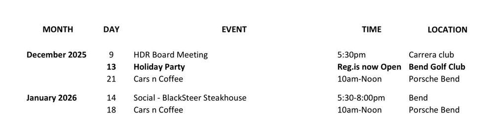 Audrey Moore, HDR’s past Tour Director, will be focusing on Porsches in High Heels in 2026. Stay tuned for a ladies lunch invite in February to share ideas and to bring back the excitement of HDR’s unique women's group.
