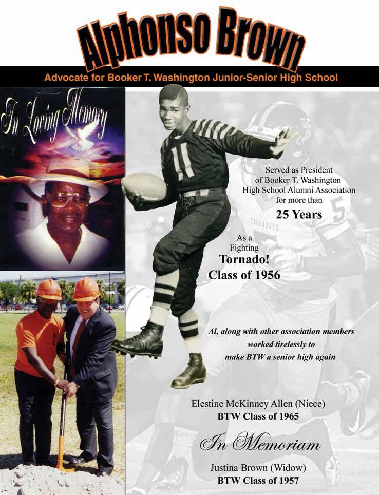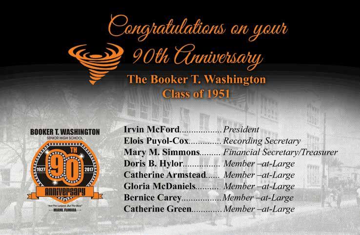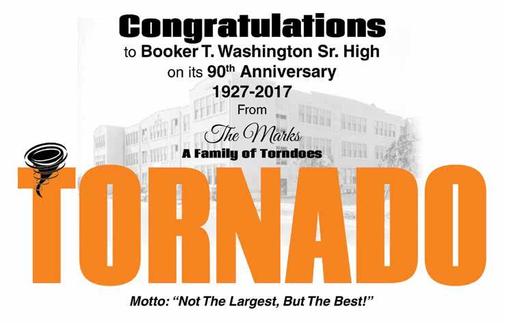Happy birthday Booker T. Washington Senior High School! Thanks for continu ing to ignite the flame of excellence and knowledge among our students and the community. The Booker T. Washington Alumni Association, Inc. joins the Tor nado family and supporters in offering our warmest congratulations to our stalwart institution of learning for past and present academic excellence! Special thanks are extended to all for sharing in this most significant time of cel ebration in “Tornado Land.” Kudos to our chairperson and committee members of the 90th Anniversary Commit tee. Recognizing the 90th Anniversary of Booker T. Washington Senior High School, founded in 1926 in Miami’s historic “Overtown” community is a noteworthy historic occasion. It has been a collaborative effort of commitment and dedication of Booker T. Washington Senior High School, its supporters, the community and the Booker T. Washington Alumni Association, Inc.