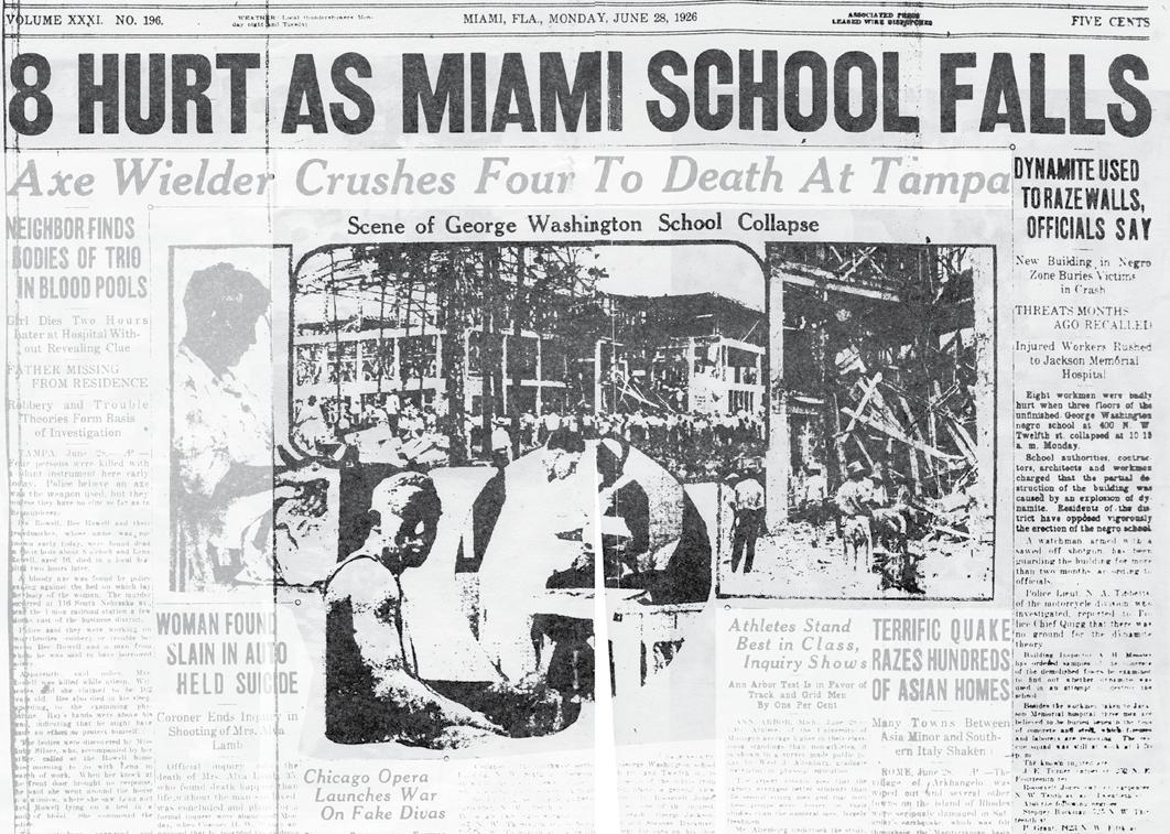 June 28 , 1926, The MIAMI NEWS (see METROPO LIS) --- published a story about the alleged “dynamiting” of the George Washington School for coloreds being built on Sixth Avenue and 12th Street. We assume that since very few white people, if any, knew about the outstanding work of Booker T. Washington and why the colored people referred to their school as Washington, that this was identified in error. Stories about the “bombing” and how the immedi ate community rallied to build fires and set up “watches” have been told and recorded. It is also a part of the history of the 6th Avenue Washington School that the 1926 Hurricane damaged the almost complete structure and prevented use. The eagle embossed upon the f ront of the building deno tes a 1.926 date .