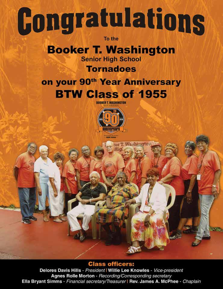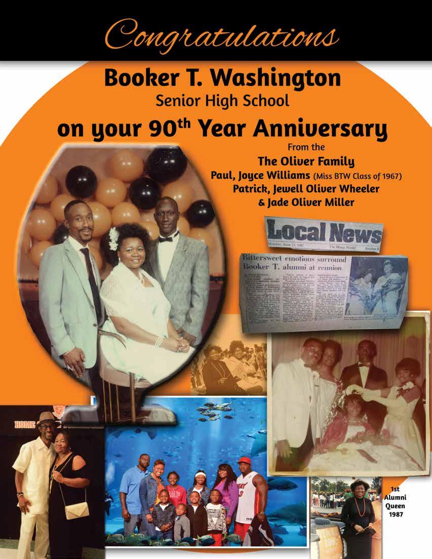 It has served as the ”Gateway to Life’s Journey to understanding and success” for many of us. In passing through, there were many “lessons learned.” We were encouraged to be steadfast in the pursuit of our goals, to always set high standards of excellence and to be solicitous and benevolent towards others. We were reminded that it takes courage to push ourselves to places that we have never been before; to test our limits, to break through barriers and most of all to believe in ourselves!...for as Washingtonians, it is no secret that... ”We are not the largest, but the best!” Always remembering to the keep the “Lessons Learned” as sources of inspiration and strengths for us in our future endeavors! Moreover, this 90th Anniversary celebration affords all of us an opportunity to share in “A Taste of Booker T. Washington Senior High School” as we reminisce and “Take a Walk Down Memory Lane” to visit the past and present experiences that are unique to BTW. Ever mindful of the rich heritage we share. For, we are “The keepers” of Booker T. Washington High School’s inspiring history and the “keepers” of our own history! Recalling “cherished days and well spent time!” Occurring through all the years with ideals sublime!” Hopefully, students and future generations will be inspired to embrace the unconquerable “Tornado Spirit” of achieving excellence that will elevate them to become successful contributing members of society. So...Congratulations Booker T. Washington Senior High School. This is your “Diamond” moment in time! Your excellent and enduring spirit will forever shine!