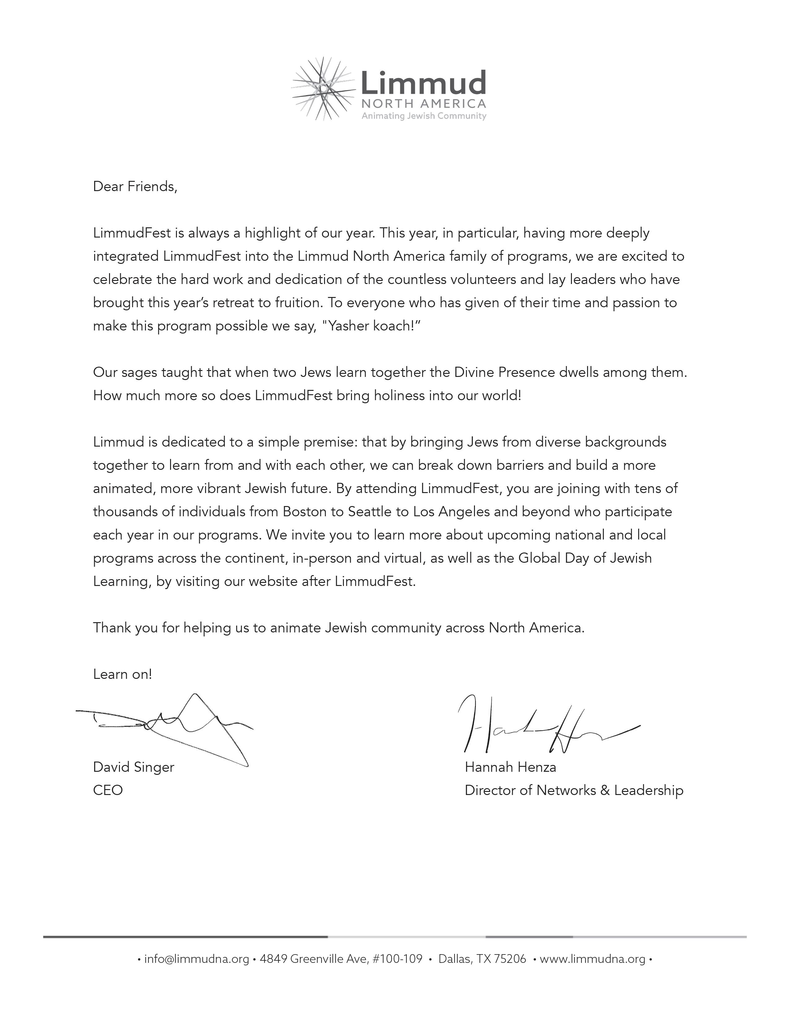 We are thrilled to have you join us for Limmud Atlanta & Southeast’s festival of Jewish learning and living. For those who are unfamiliar, Limmud, founded in England in 1980, is an international movement committed to bringing Jews of all backgrounds and affiliations into a process of shared learning and teaching. LimmudFest has grown into the largest residential Limmud event in the U.S.!