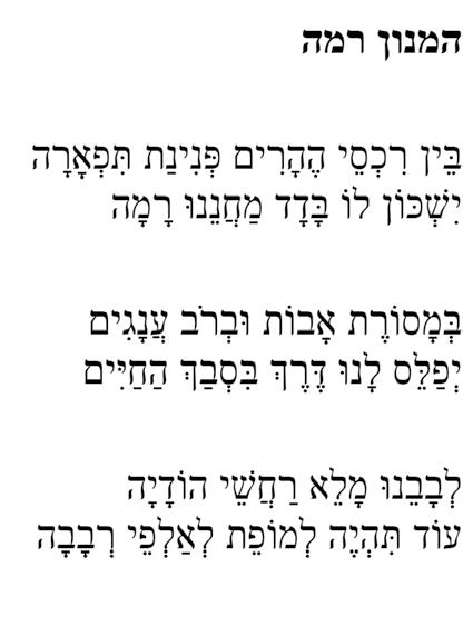 Bein reechsay he-hareem peneenat teefarah yeeshkon lo badad machaneinu ramah