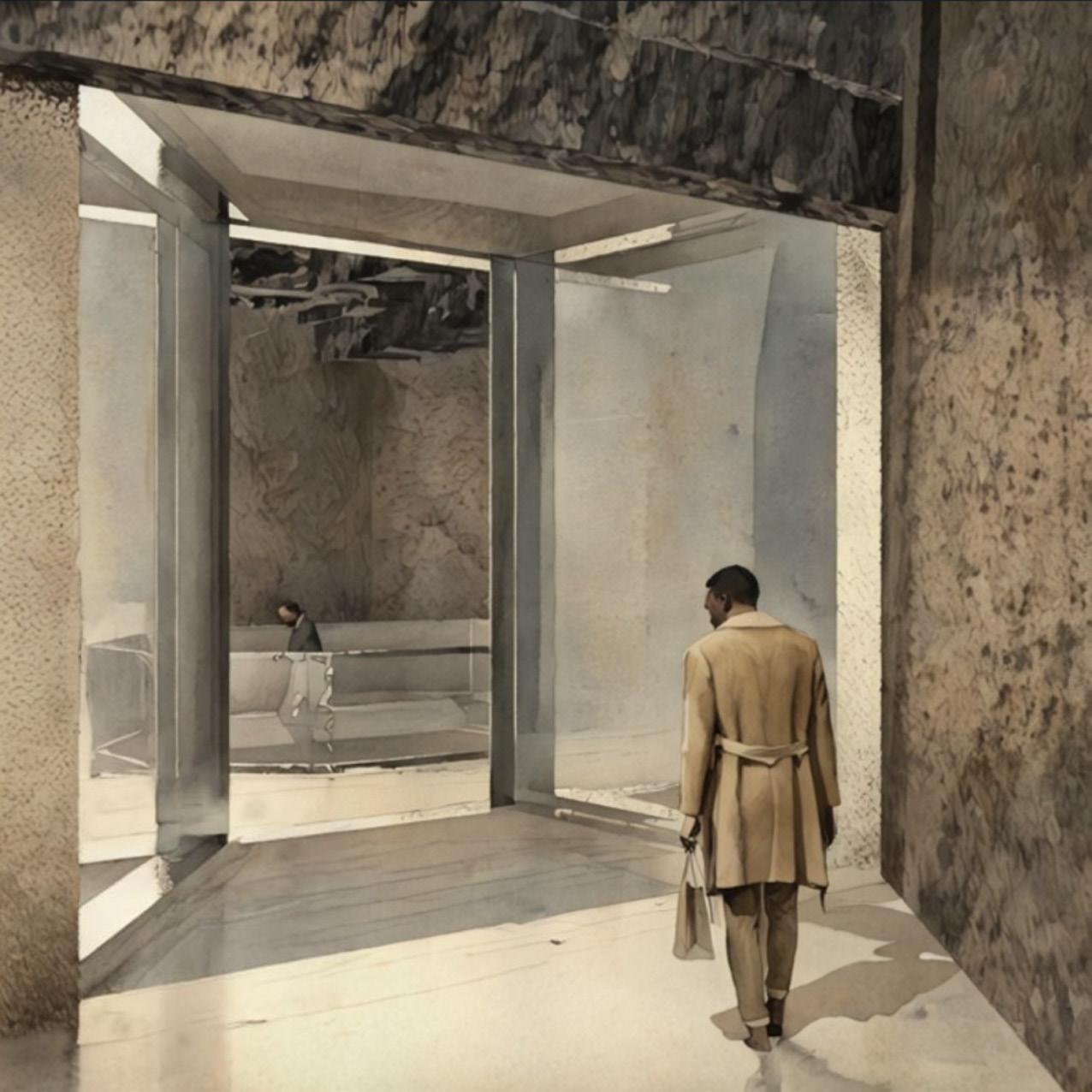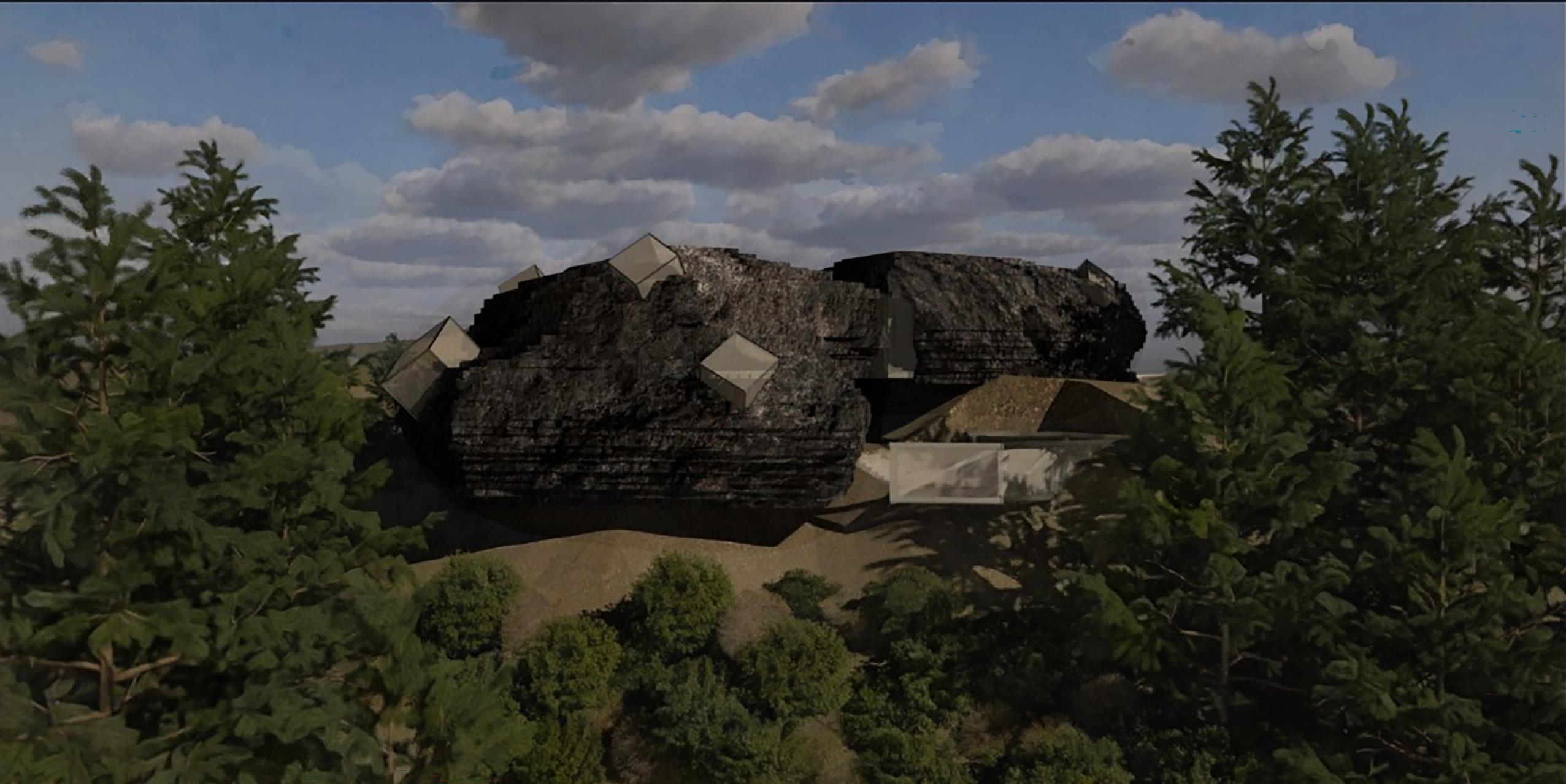 This project utilizes the concept of biomimicry to engage with the site. It takes inspiration from the concept of a geode, defining boundaries of the exterior and interior. Conceptually, it mimics the process of a geode breaking in half, with some crystal particles falling out. The retreat center is separated into three components. The first houses public spaces, including laboratories, offices, and a machine room. The second contains more residential parts, including the various bedrooms for the scientists, the dayroom, the kitchen, and personal storage. The third and final component is the outdoor amphitheater. This represents the portion of the “crystal” that broke off and fell. To exemplify this, a glass bridge is also implemented between the 2 main masses. The facade features glass fiber-reinforced concrete panels to mimic that of a stone, and is derived from the case study, “The Chapel of Sound, designed by Open Architecture.” The 2 main components in the parti of this concept are the “shell” and the “crystal”. The Shell, as mentioned, is gfrc, and the crystal component is glass. Another instance of biomimicry seeks inspiration from natural pyrite crystal cubes on matrices. This concept is used to incorporate aperture as skylights into the spaces. In order to get the sectional qualities of this project, the structural framing predominantly uses HSS circular steel tubes. This allows for the structure to follow the form of the structure.