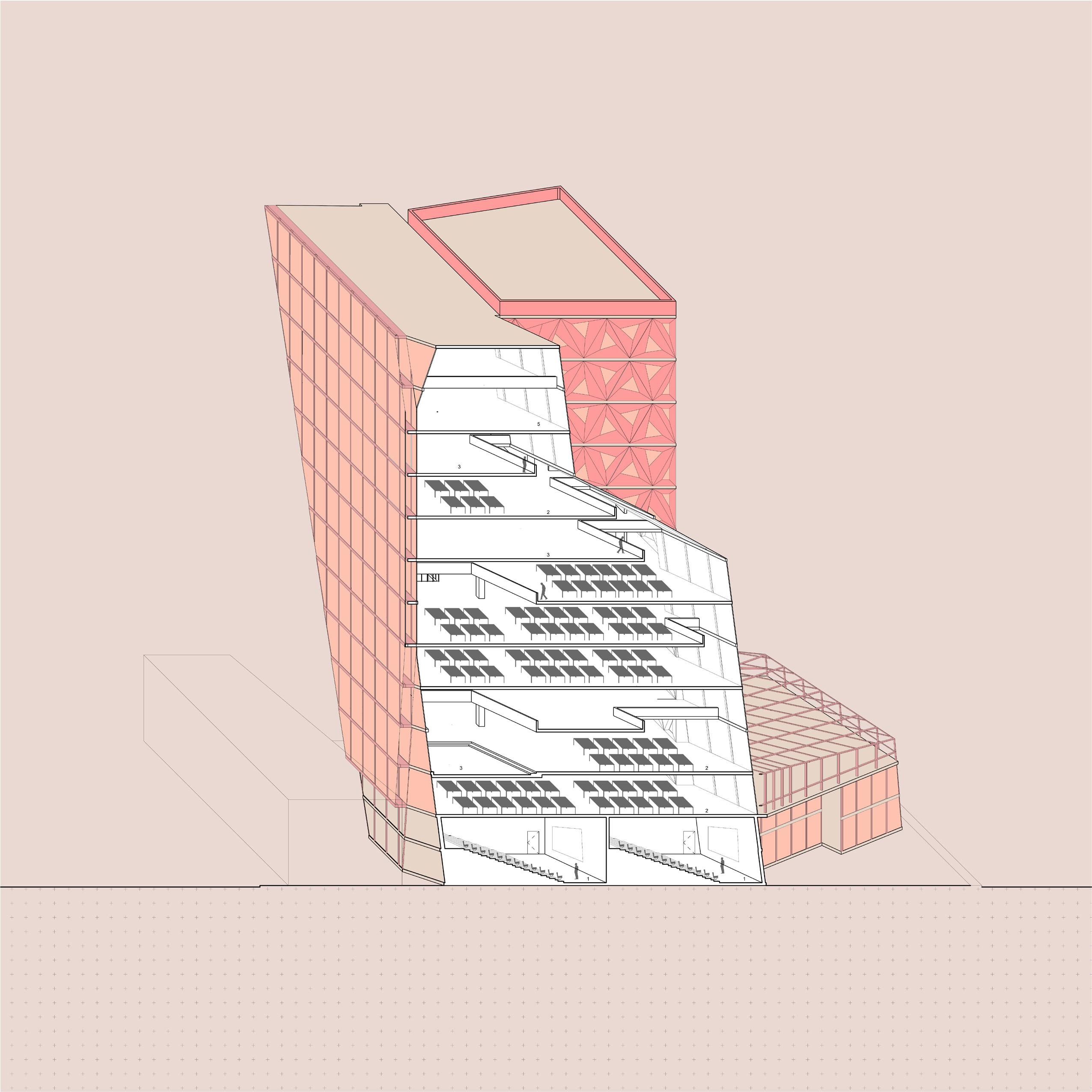 The main concept of this school of architecture tower is to differentiate between pragmatic and non-pragmatic spaces by following a distinct parti: a uniform element being enveloped by a nonuniform element. Initially using a series of clusters to derive the form of the structure, it transformed into a diagram following angles at 15 degree increments. The uniform, pragmatic component houses the more static spaces, such as offices, classrooms, and library archives—the non-pragmatic houses the studio spaces, open discussion spaces, and lounges. By situating these spaces, this project fosters an environment conducive to creative exploration, collaboration, and innovation, redefining the conventional boundaries of architectural pedagogy and practice. Changes in ceiling heights and overhead beams create a soft boundary between pragmatic and nonpragmatic, following the parti. While the form allows it to differentiate between the 2 forms, the structure also incorporates 2 facade elements. The Uniform component uses situ concrete to form a triangulated pattern in the form of a diagrid, whereas the latter, utilizes a double-skin glass system. This triangulated pattern is carried over the interior elements such as rails on overlooks, as well as a lighting frame for the ceilings. The plinth acts in unison with a rooftop deck, carrying over the diagrid system onto its form.