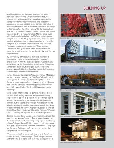 additional funds for first-year students enrolled in Ramapo’s Educational Opportunity Fund (EOF) program, in which qualified, many first-generation, college students receive financial and academic assistance. Mercer noticed in his earliest years that a disturbing number of EOF students were not returning to Ramapo after their first year, while the graduation rate for EOF students lagged behind that of the overall student body. For many families, Mercer says, even with the financial aid given to EOF students, it posed a significant hurdle. He proposed using discretionary funds to eliminate that hurdle altogether and enable first-year EOF students to attend Ramapo cost-free. “It was amazing what happened,” Mercer says. “Retention and graduation rates improved to the same level as the rest of the student body, and they’ve stayed there.” By any variety of measures, Ramapo has raised its national profile substantially during Mercer’s presidency. In 2011 the business school was formally accredited by the Association to Advance Collegiate Schools of Business, the largest such accrediting agency. Worldwide, less than five percent of business schools have earned this distinction. Earlier this year Kiplinger’s Personal Finance Magazine named Ramapo among the “100 Best Values in Public Colleges” nationwide, the tenth straight year that Ramapo has made the list. U.S. News & World Report also ranked Ramapo fifth among public institutions and 26th overall in its “Regional Universities North Rankings.”