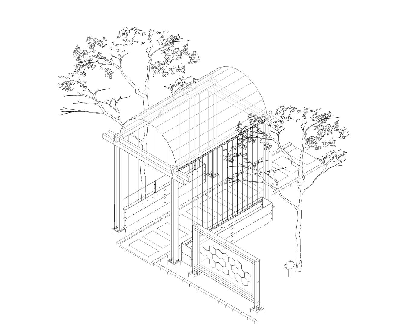 The design direction was to maintain the original trees on site and translate a parti diagram of a tree fragmenting and branching out - from the size of the trunk to that of the leaves, into a design. The arrangement of modules results in a third, in-between space. This would in such be used as a courtyard or other activities.