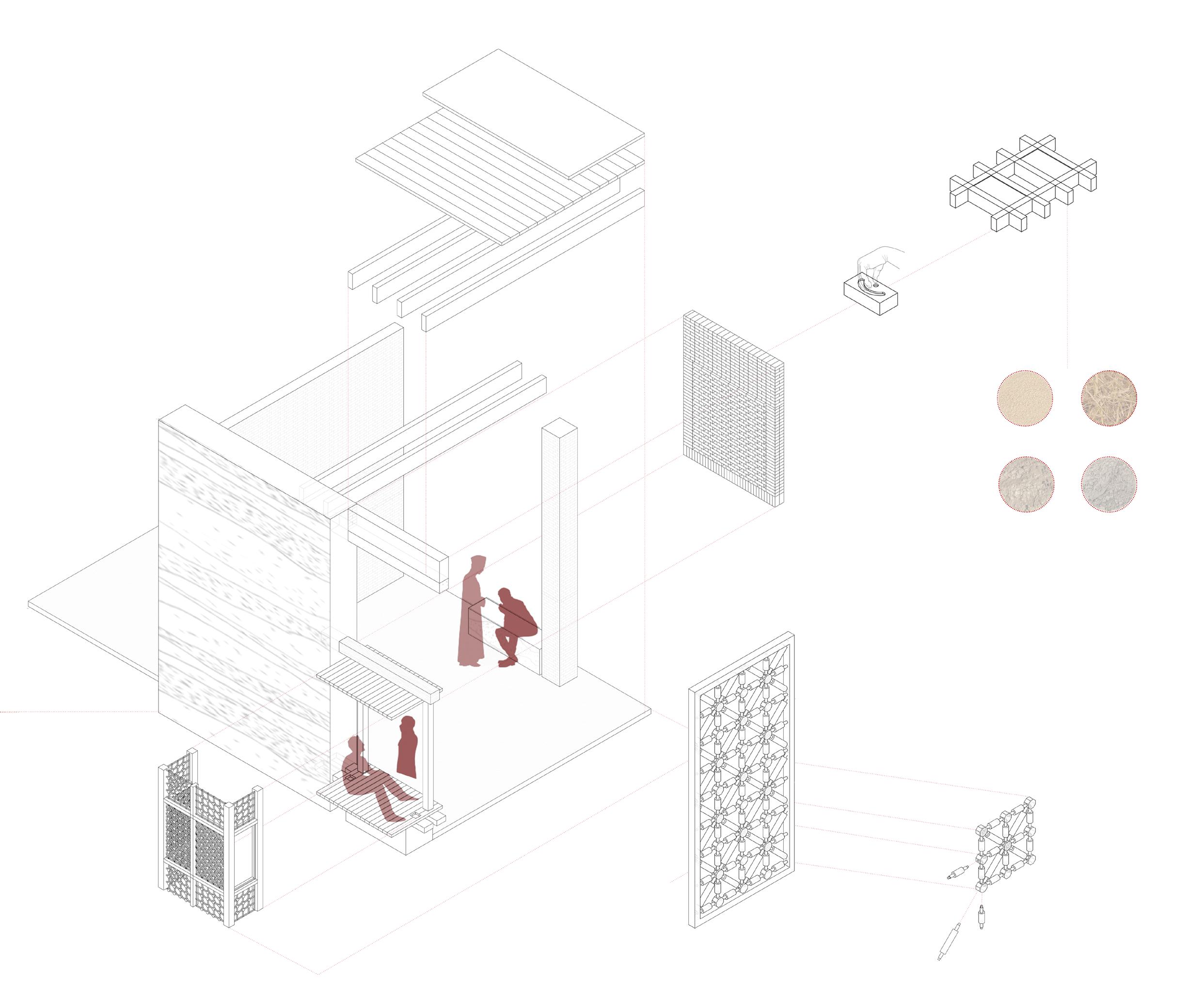 Typical water collection spaces are constructed around the site first to initiate growth and rebuilding their homes with construction skills around modules. The typical module from the site is replicated and dispersed around the site to initiate the permanency.