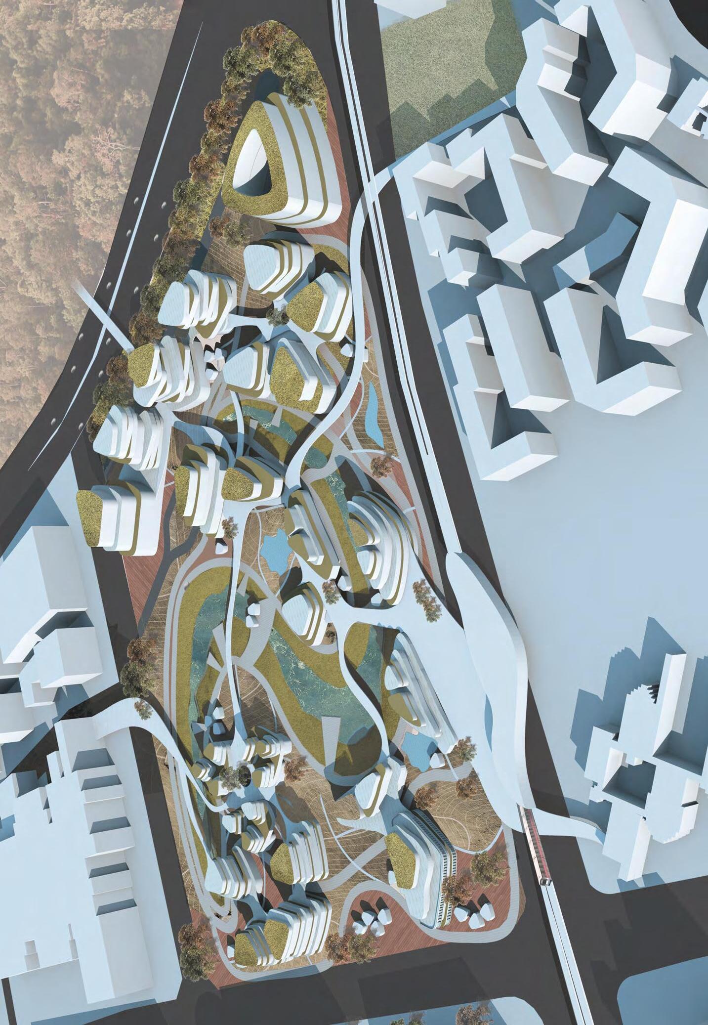 The site design focuses on walkability, encouraging movement and a combination of water and landscaping to create a peaceful, park-like environment. Landscaping is also used as a key connector for different zones and groups of people in the site and neighbouring areas. The inbetween spaces of the clusters are equally as important as the cluster itself.