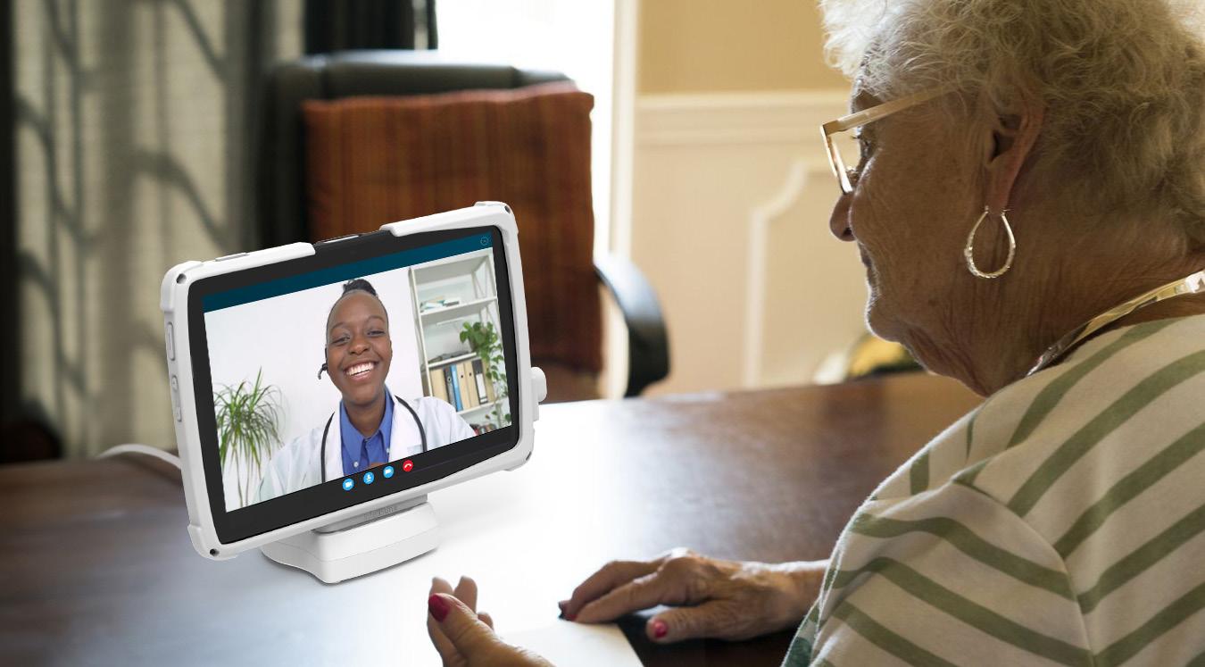 IntelliSkin®-wrapped tablet placed on a desktop dock props the device up and removes the need to fumble with cords for patients with dexterity challenges.