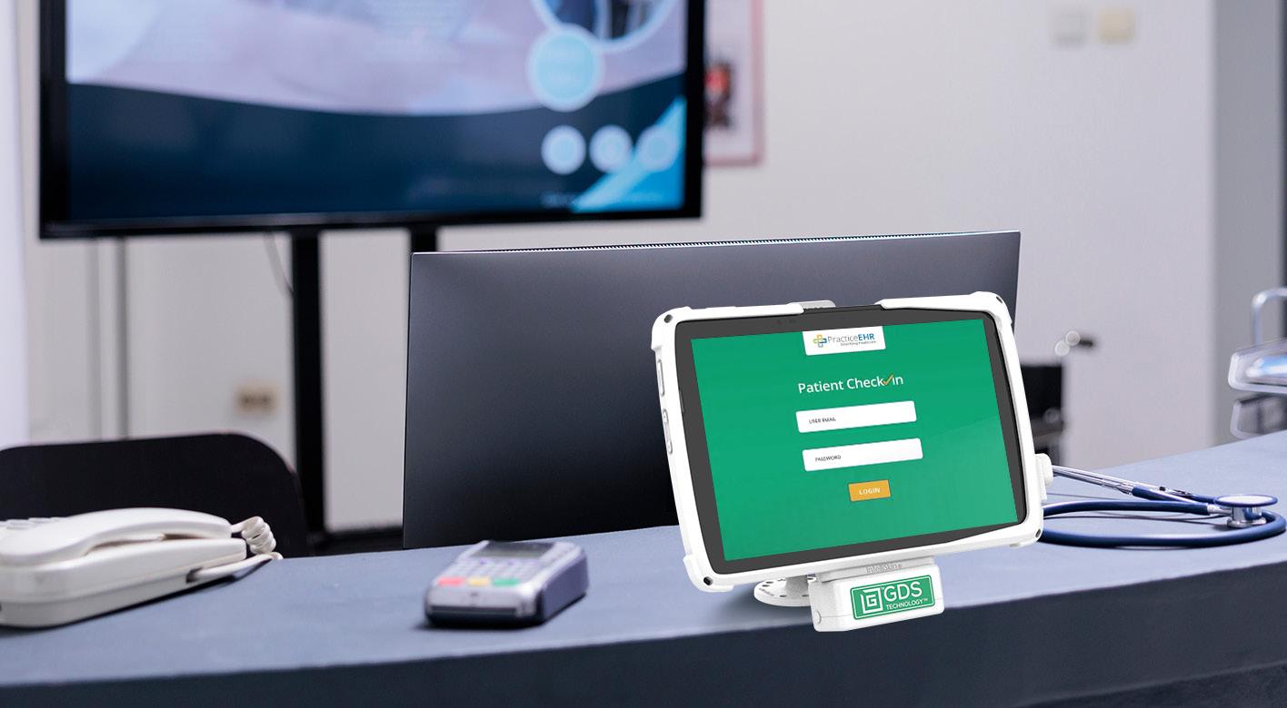 Stationary tablet kiosk stations with quick removability for patient check-in with IntelliSkin® and Uni-Conn™