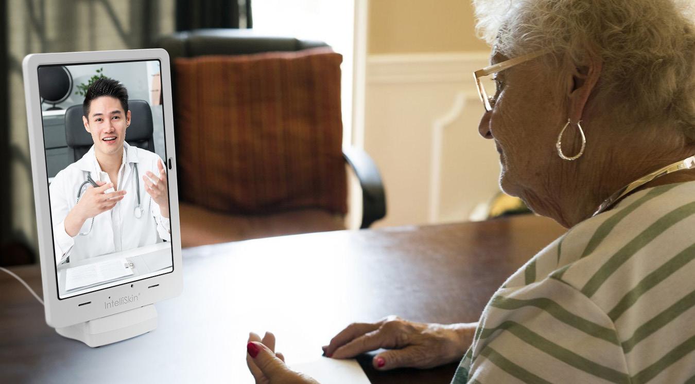 IntelliSkin®-wrapped tablet placed on a desktop dock props the device up and removes the need to fumble with cords for patients with dexterity challenges.