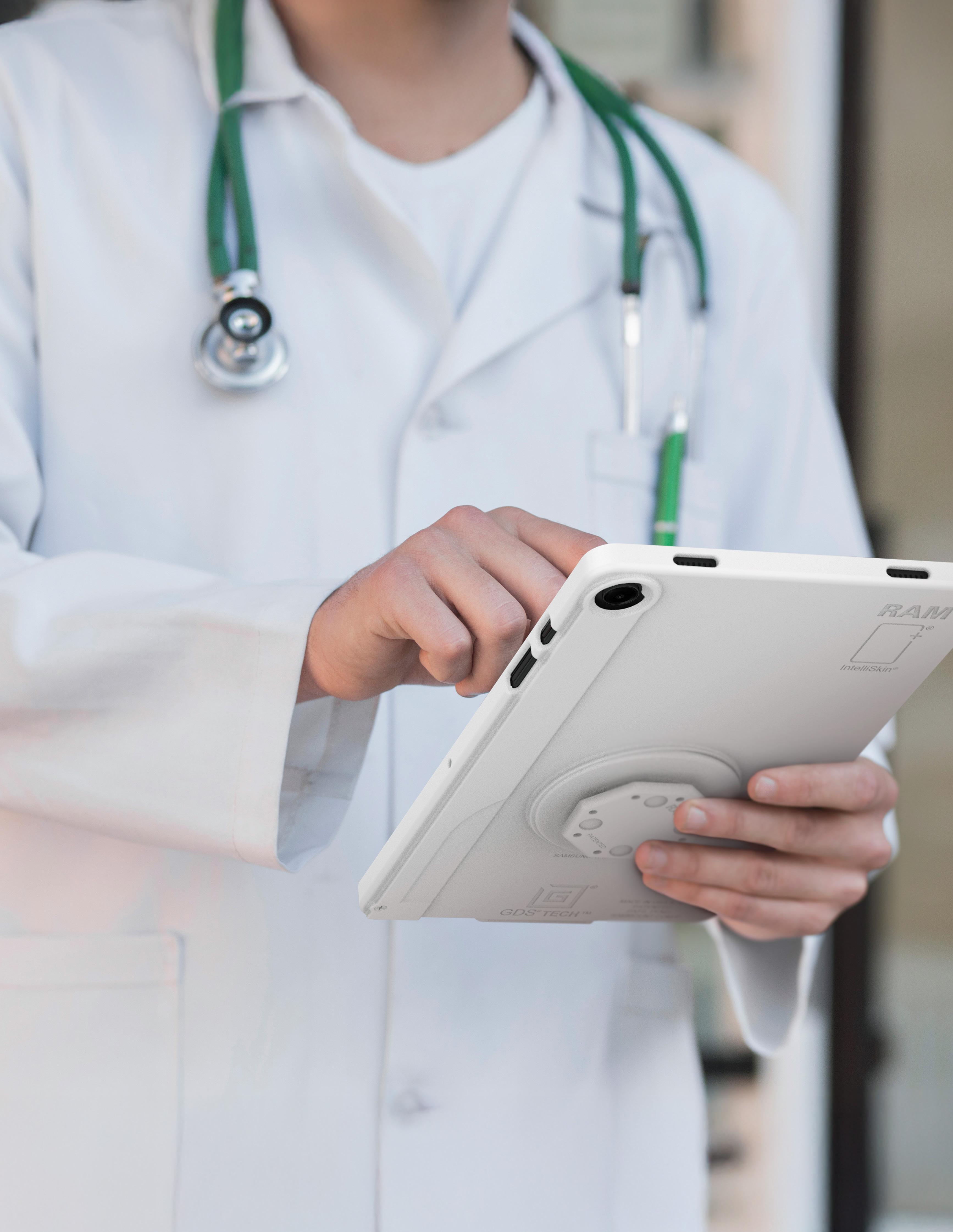 RAM® Mounts provides secure, customizable mounting solutions for tablets, monitors, medical devices, and more. These solutions support a wide range of clinical applications—from mobile workstations and telehealth carts to patient monitoring and diagnostic setups.